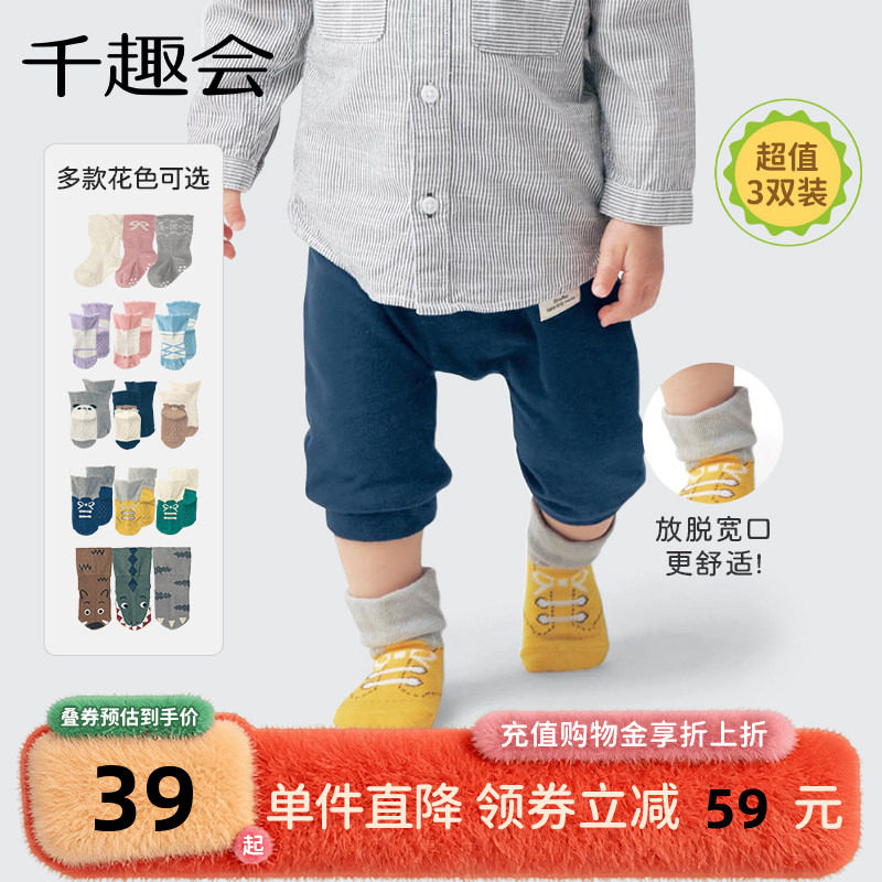 千趣会婴童袜子0-2岁防滑防脱透气婴儿婴幼儿宝宝宽口袜3双装