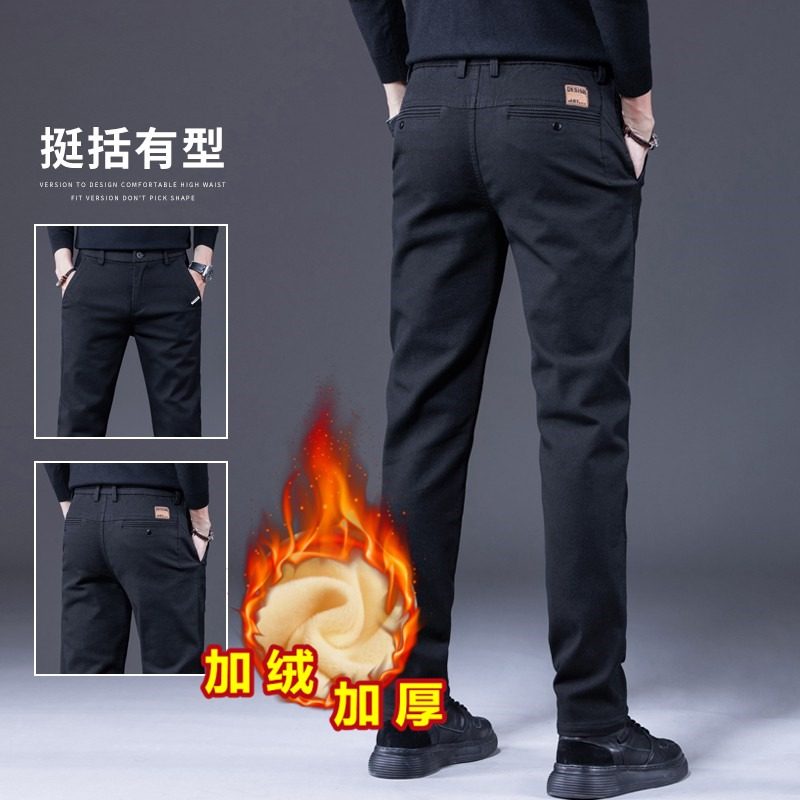 黑色休闲裤男士秋冬加绒加厚修身直筒长裤子显高百搭弹力商务西裤
