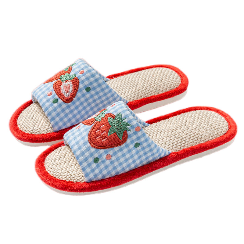 草莓亚麻拖鞋女春秋四季居家室内棉麻透气防滑静音地板家用情侣男
