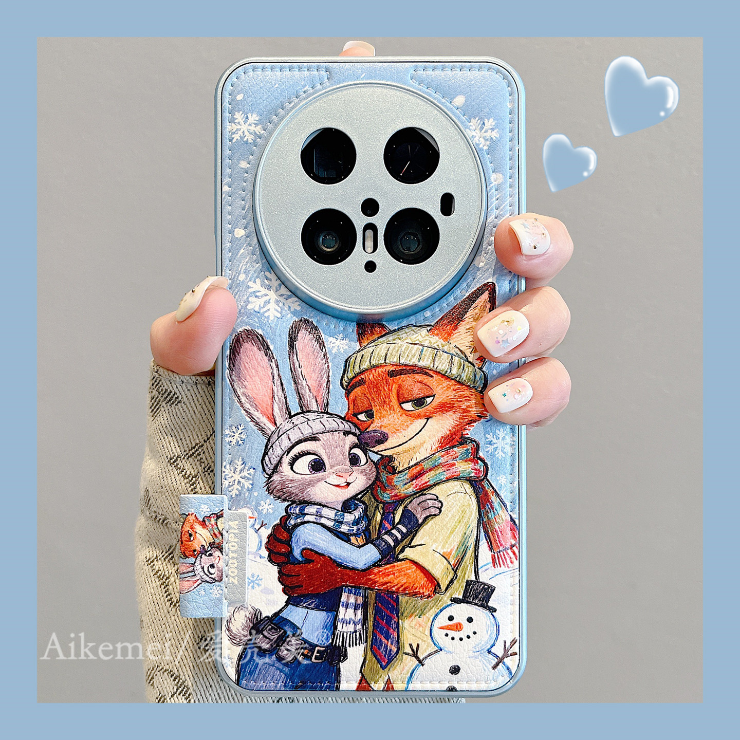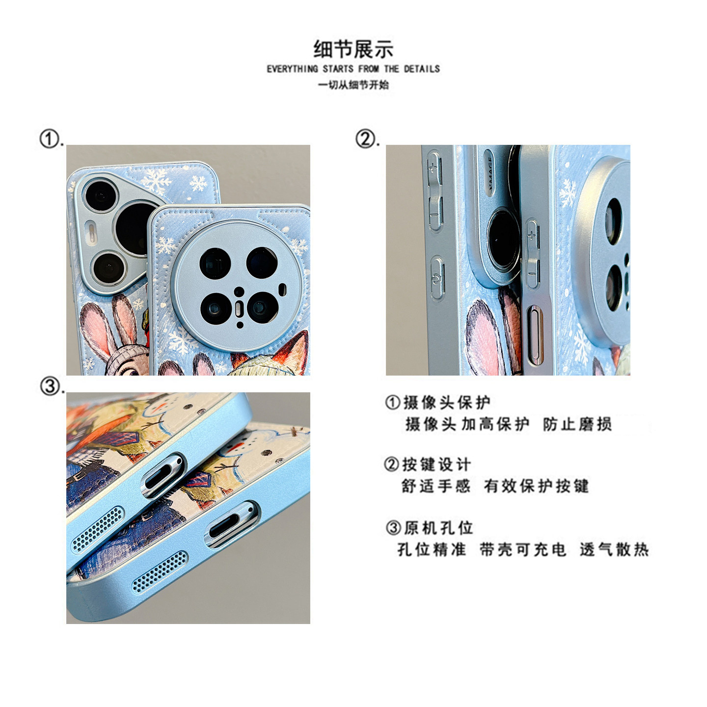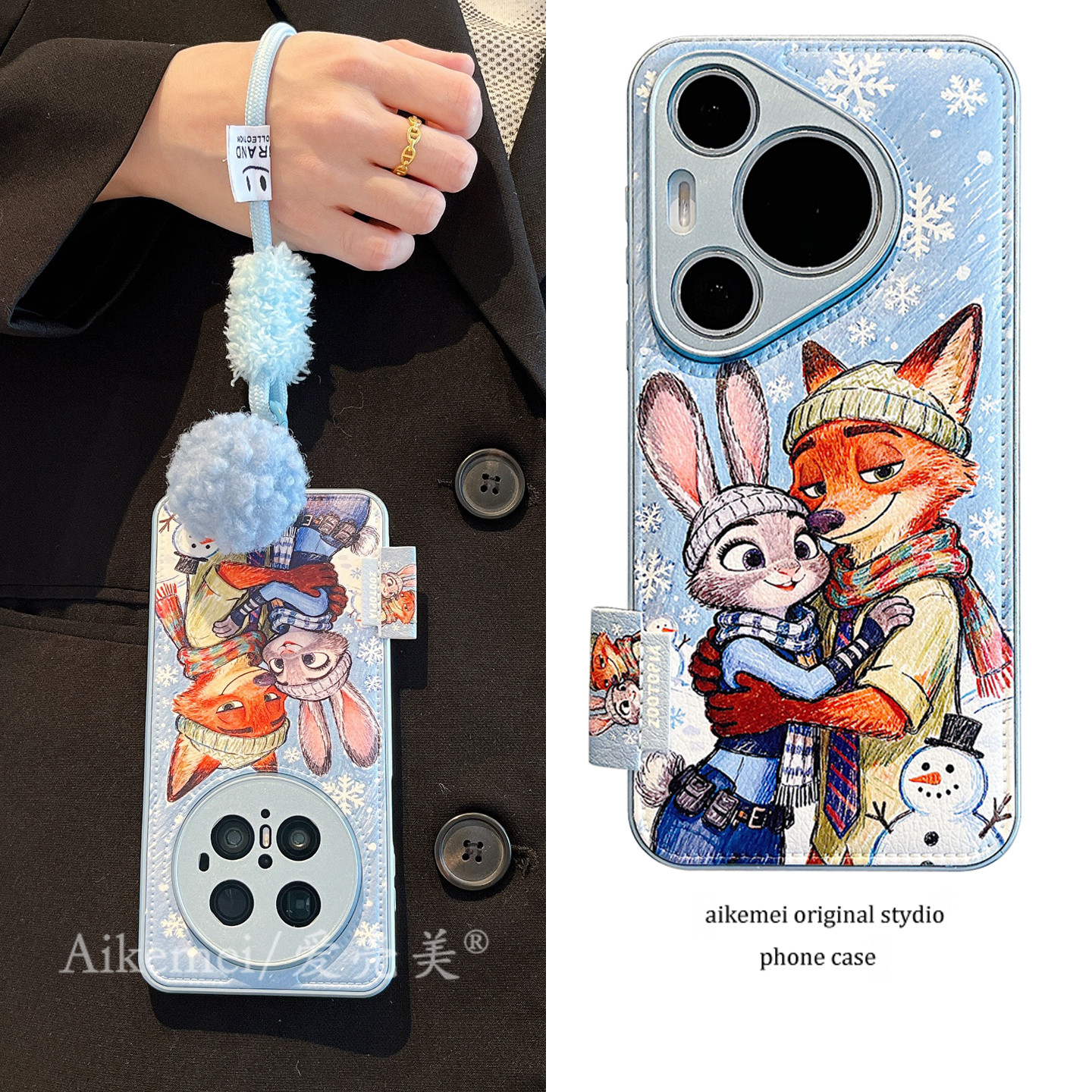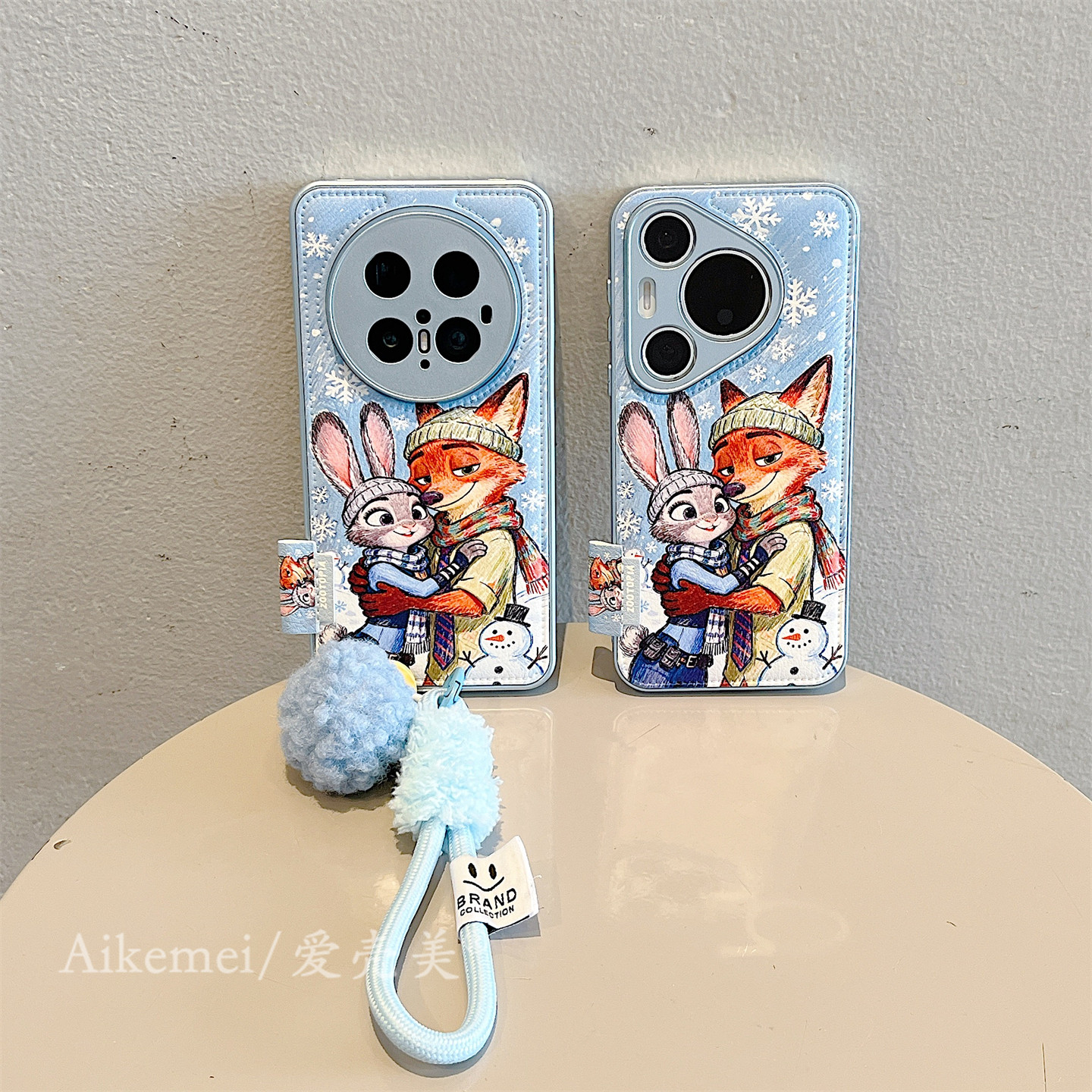 适用华为mate80pro+手机壳可爱卡通油画雪花相拥朱迪尼克mate70pro毛球铃铛挂绳MT70鼓包皮纹pura80pro防摔女