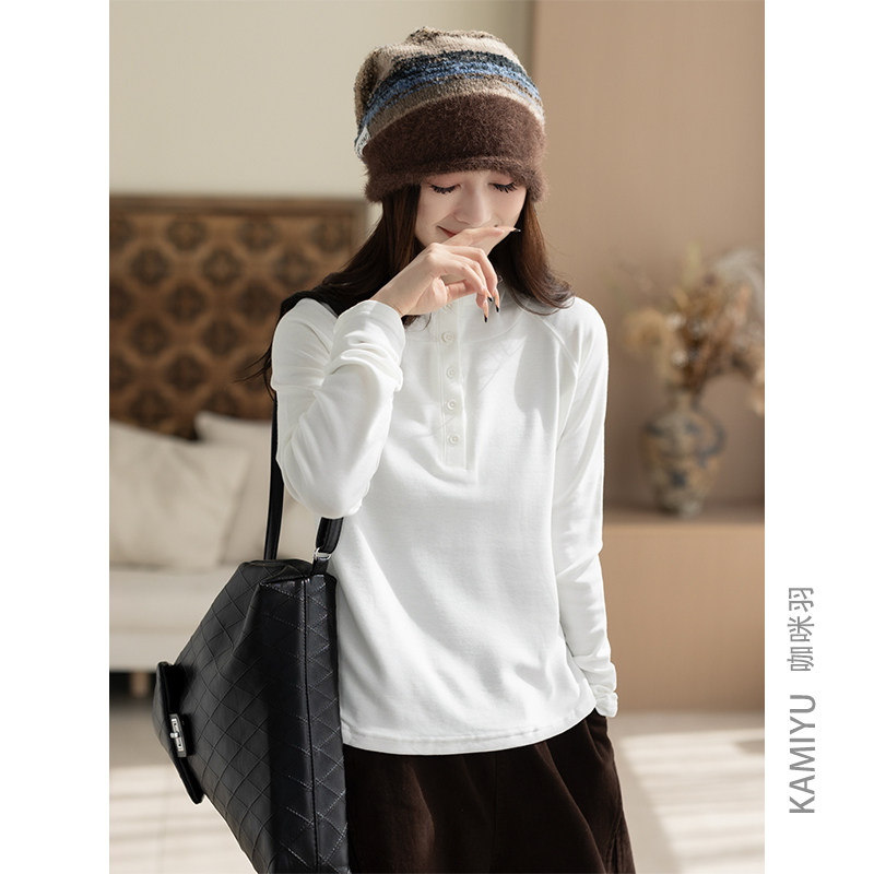 蕉下亨利衫女长袖T恤v领秋冬修身保暖低领打底衫半开领白色上衣
