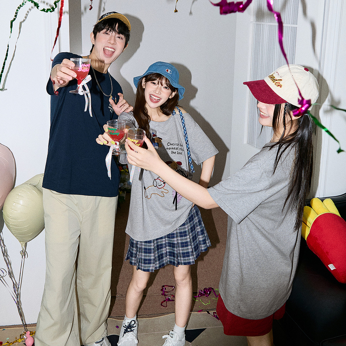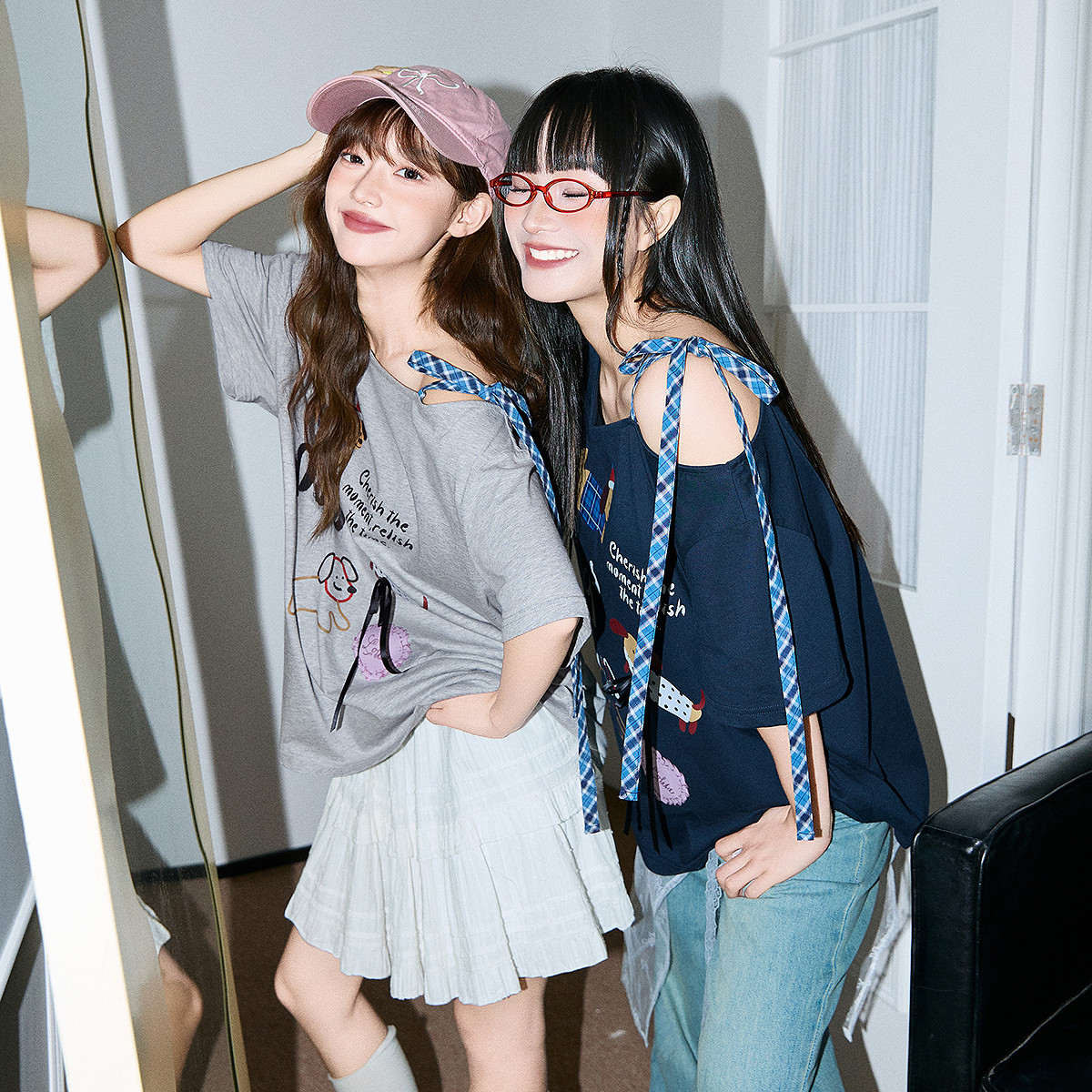 唐狮夏新款情侣T恤露肩绑带设计感上衣圆领灰色打底男女潮流行tu