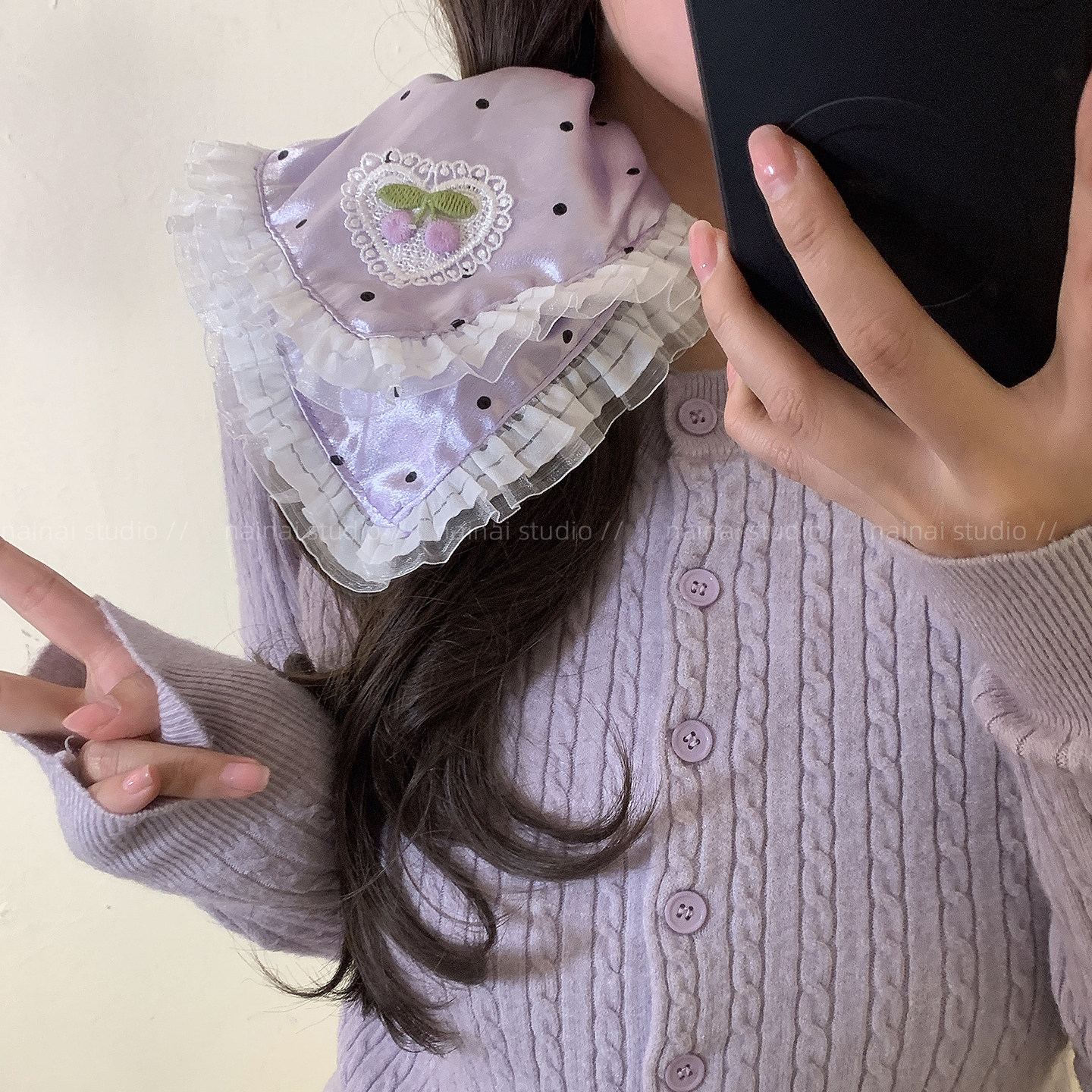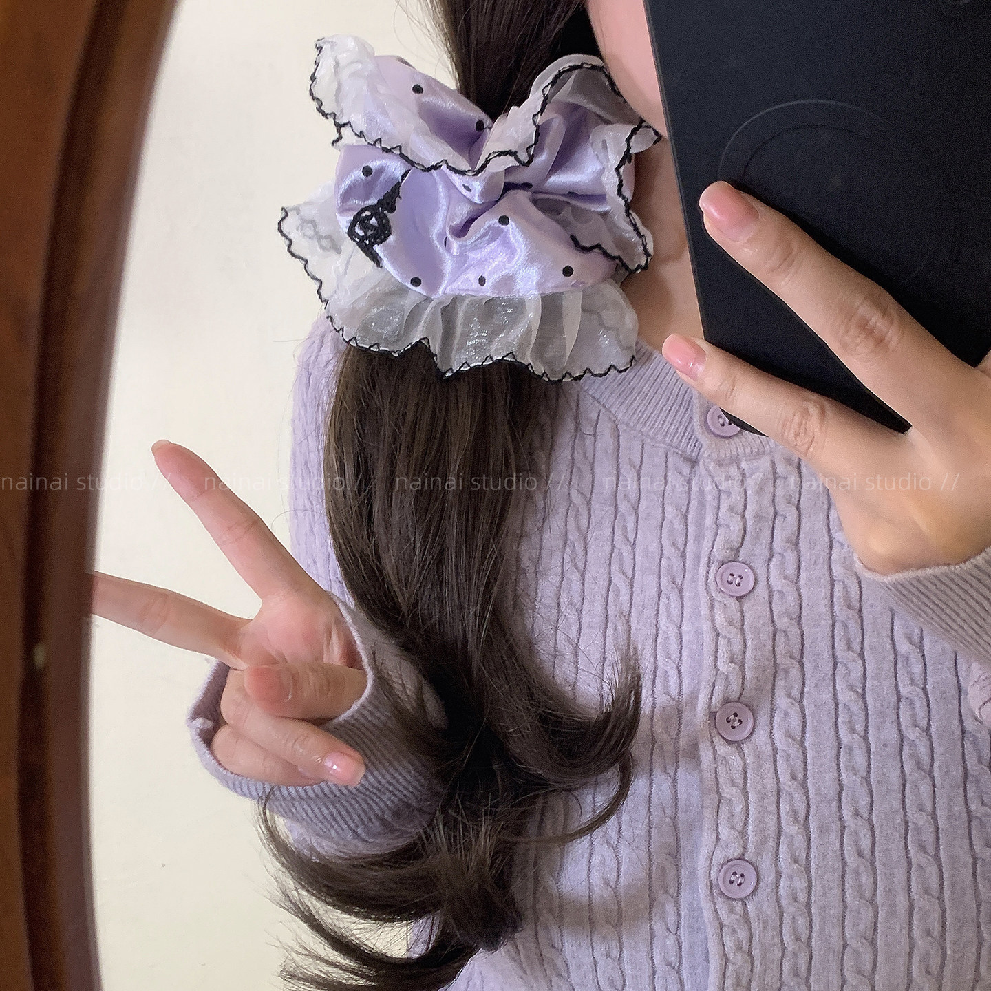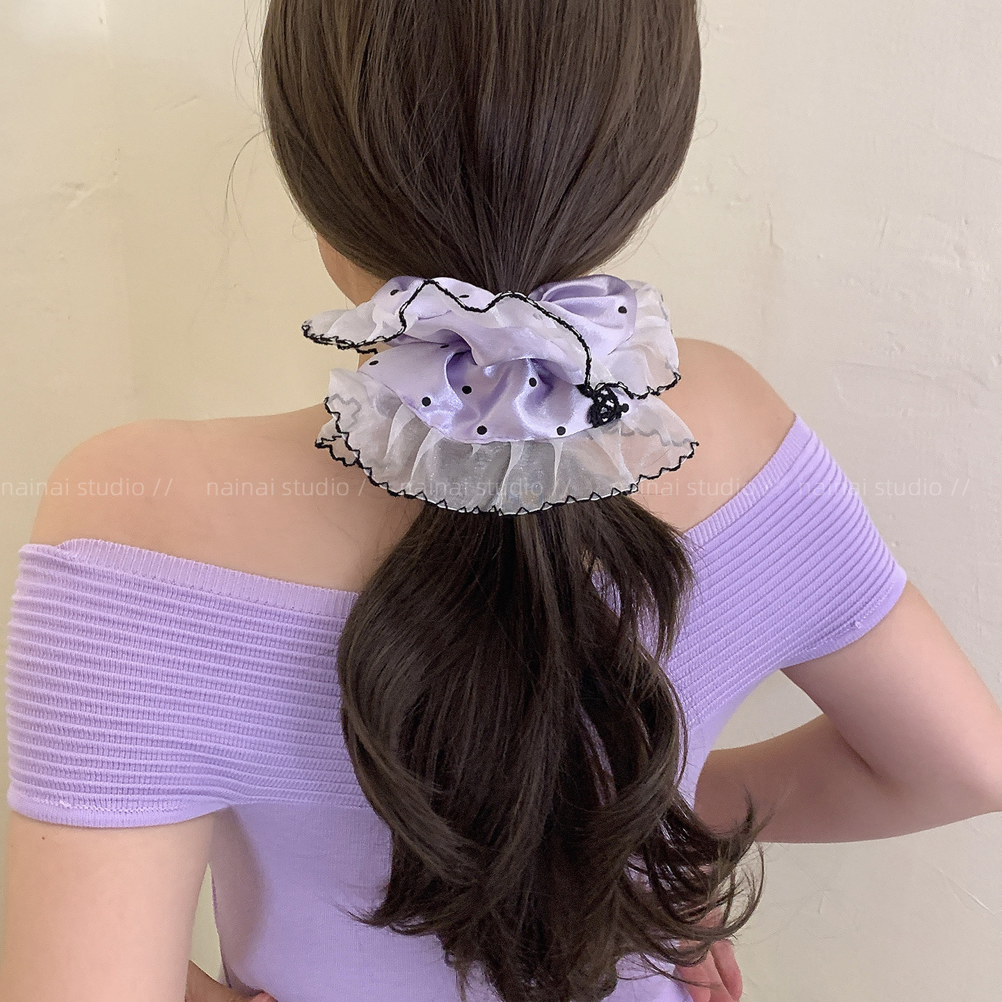 紫色波点大肠发圈~蕾丝花边方巾复古法式高级感低马尾丸子头发绳