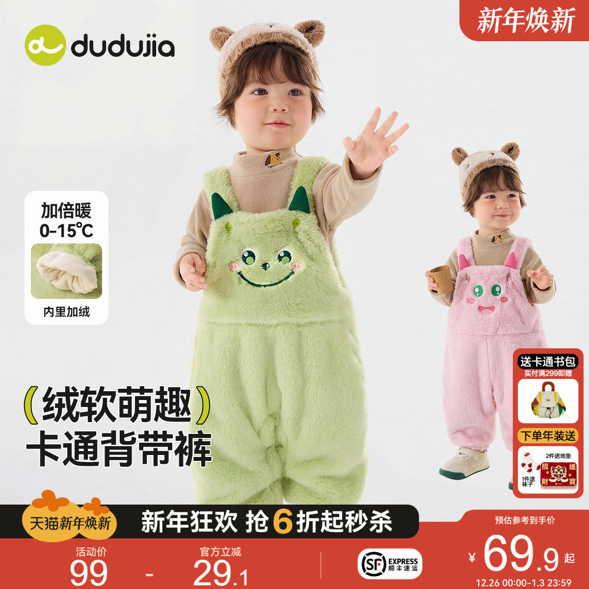 嘟嘟家宝宝裤子冬季男童加绒背带裤女童加厚休闲裤冬款儿童长裤潮