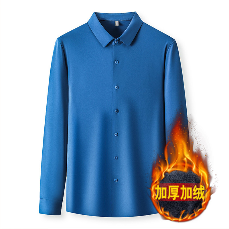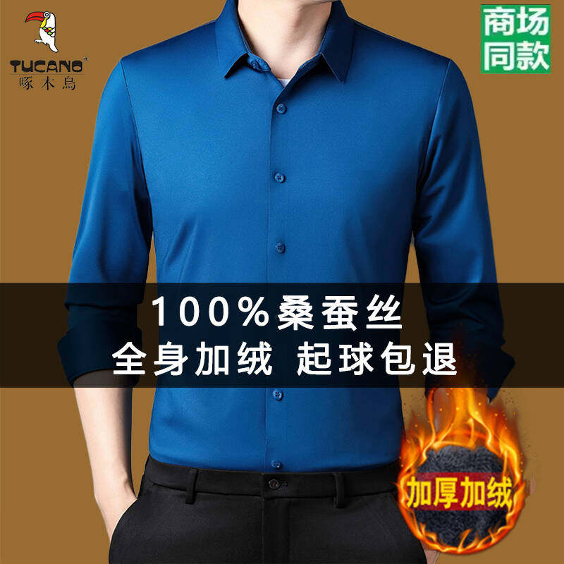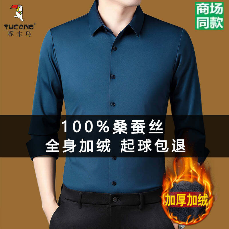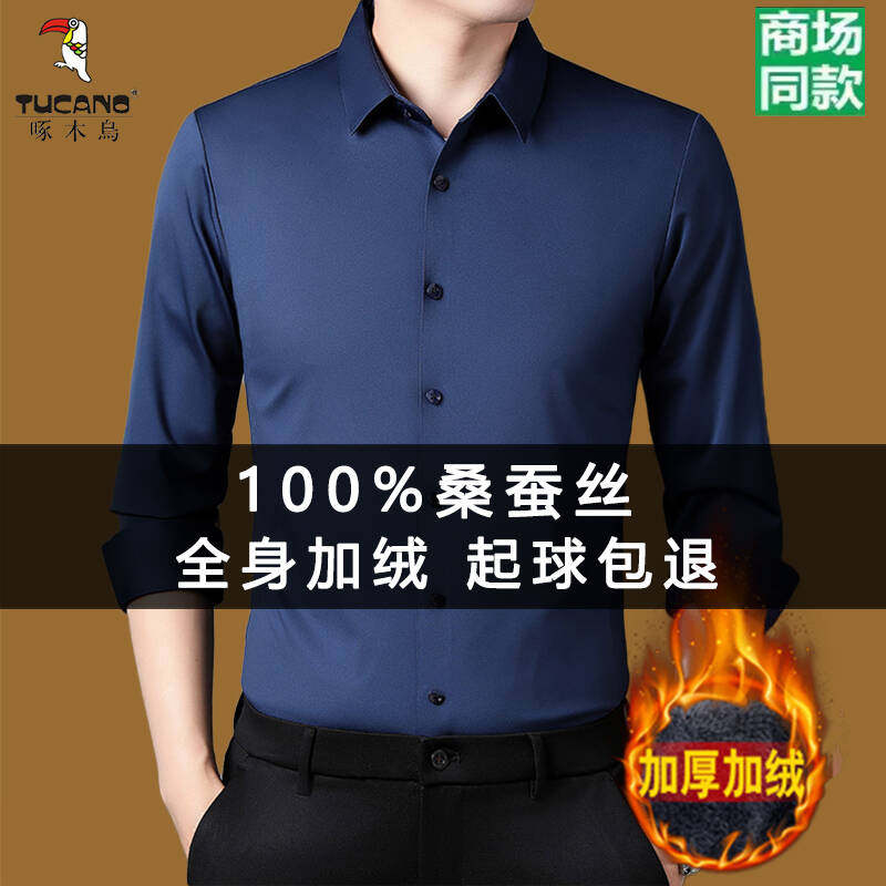 啄木鸟冬季加绒加厚保暖衬衫男士长袖一体绒高级感免烫桑蚕丝衬衣