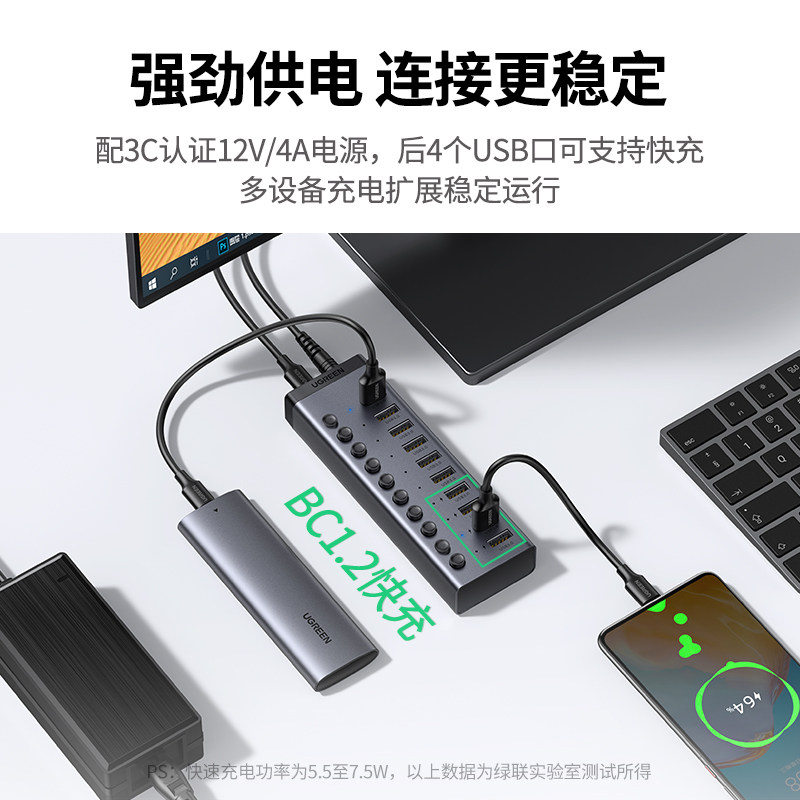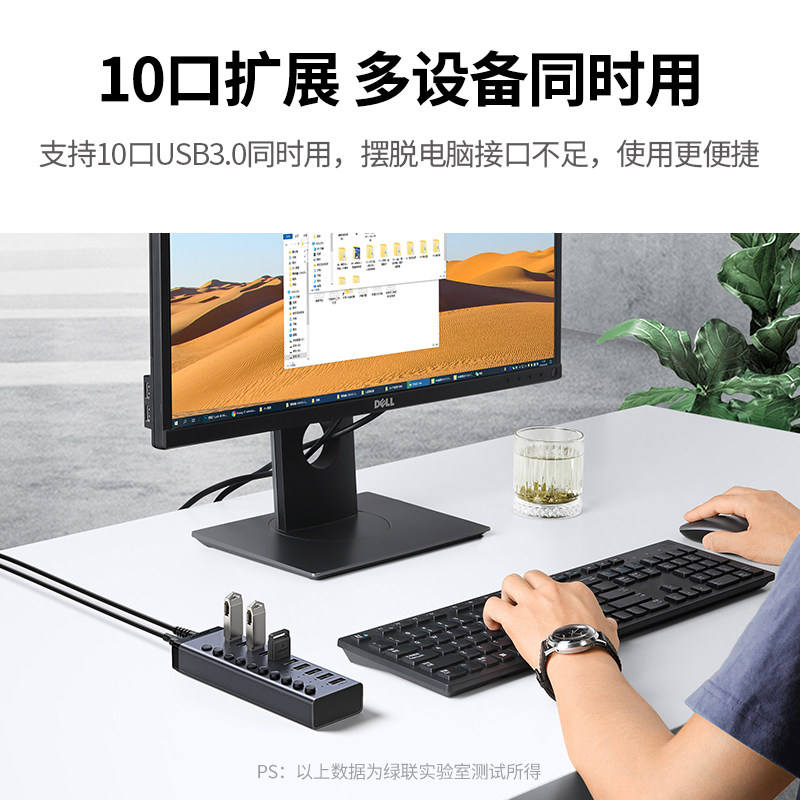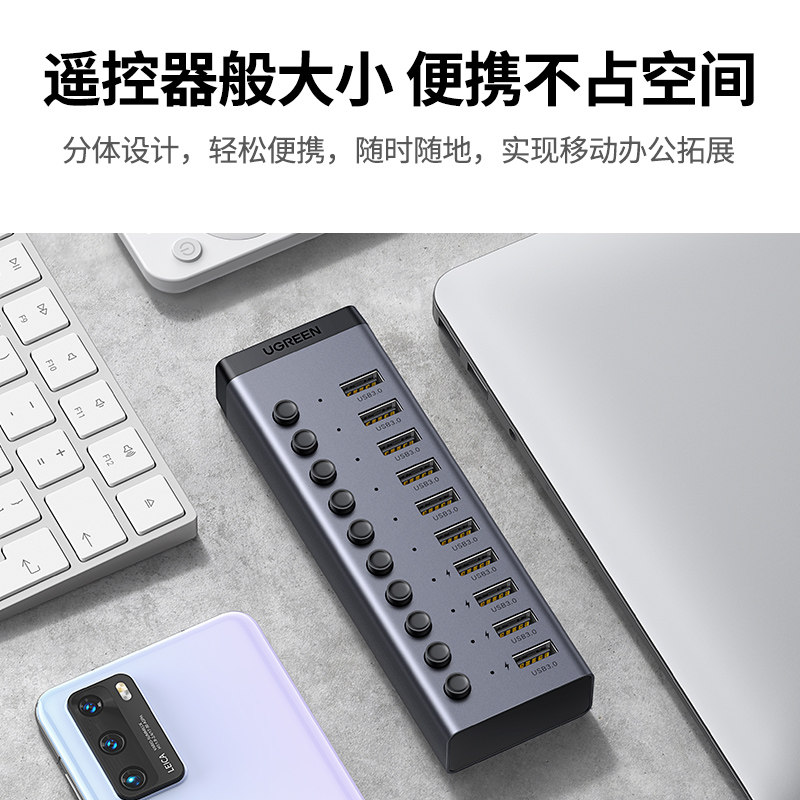 绿联USB3.0扩展器一拖7/10口多口高速集分线器笔记本电脑外接HUB带电源手机充电转接头U盘转换多接口群控刷机