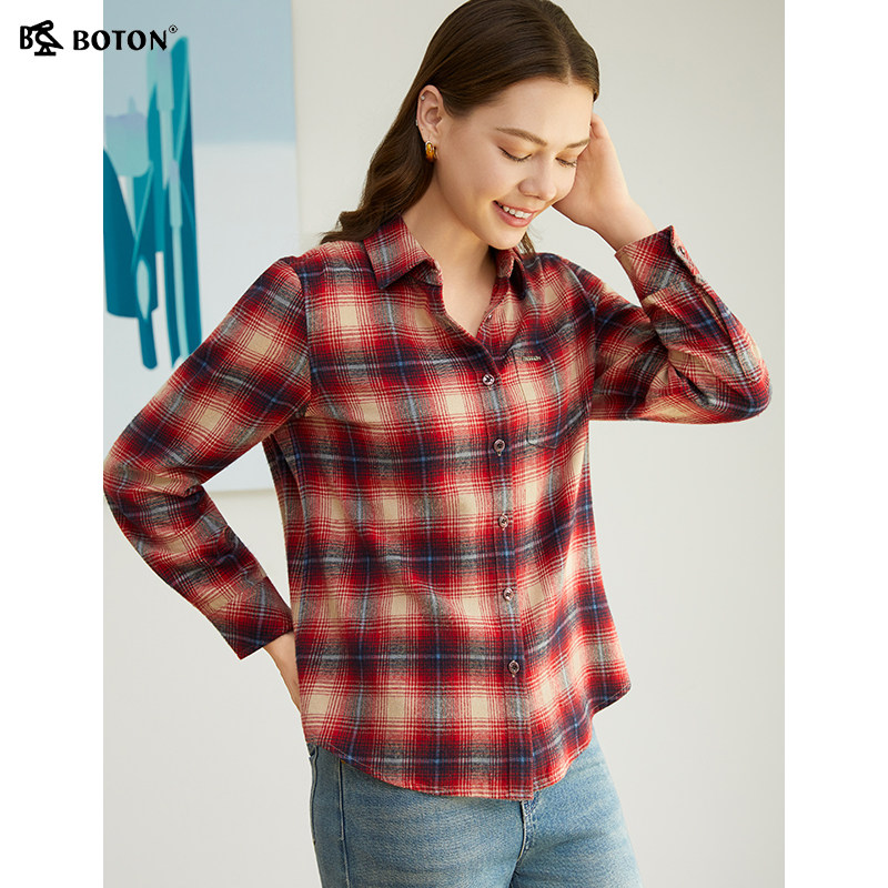 波顿秋冬新款翻领长袖磨毛格子全棉衬衫修身通勤休闲衬衣百搭舒适