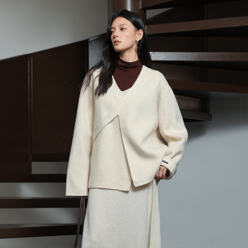 黑标BAIZHUO冬季新款新中式V领交叉门襟双面呢毛呢外套AZ44DY335