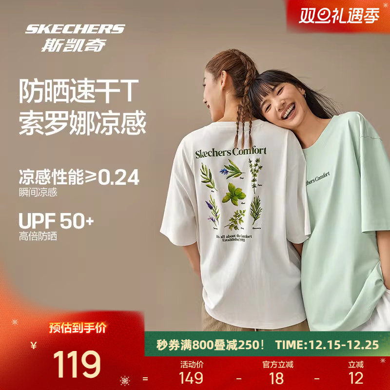 斯凯奇情侣T恤男女款印花运动短袖绿色户外健身白色舒适宽松休闲