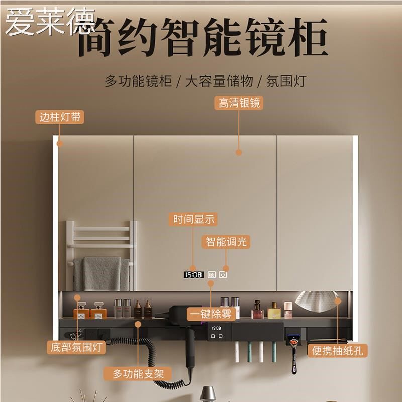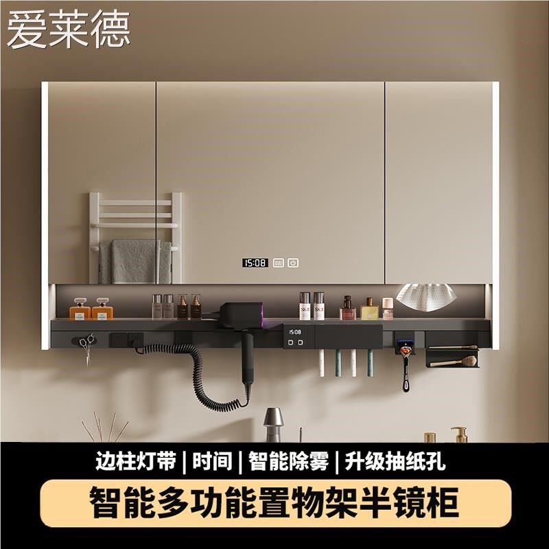 智能浴室镜柜单独挂墙式带灯防雾卫生间镜子电吹风机架收纳一体柜