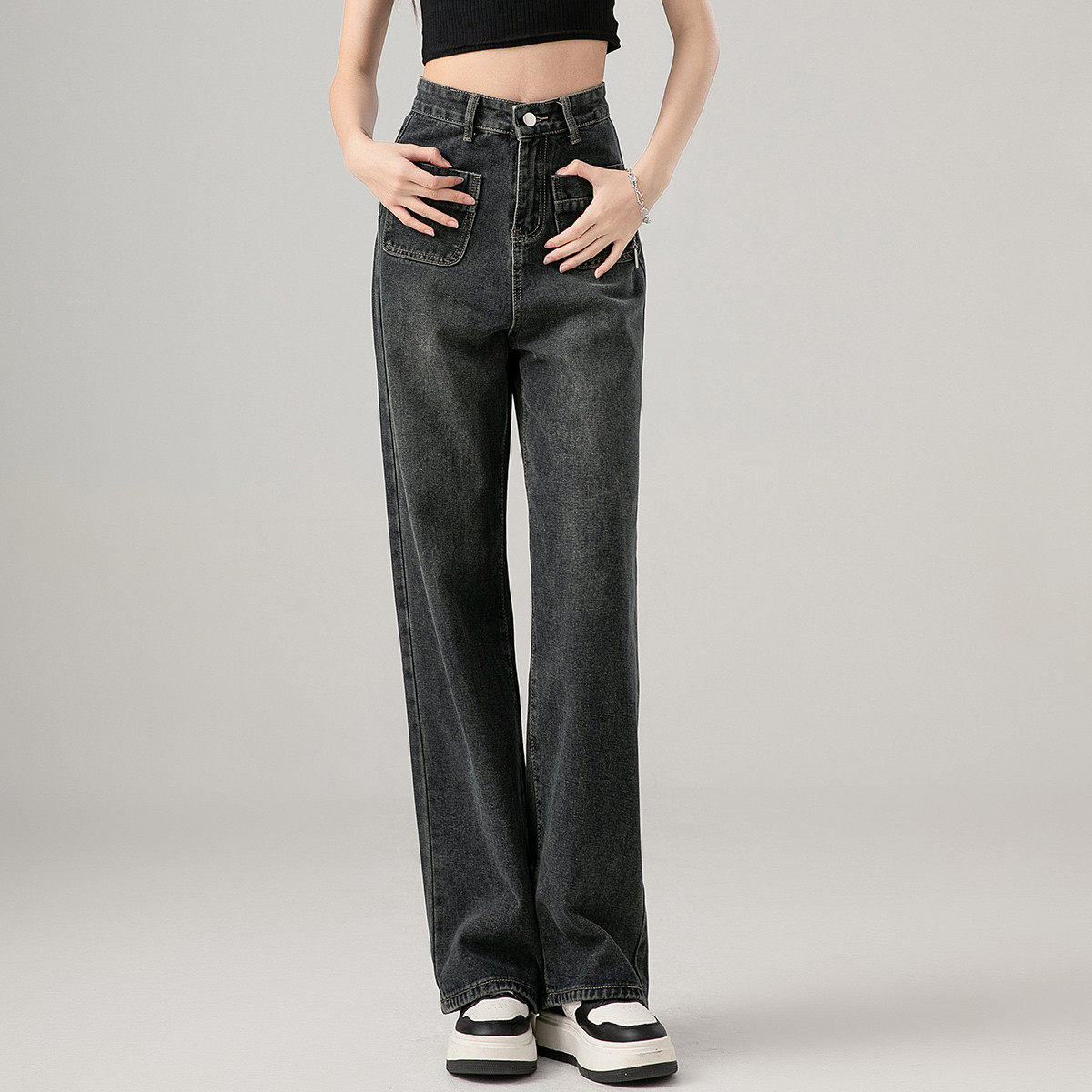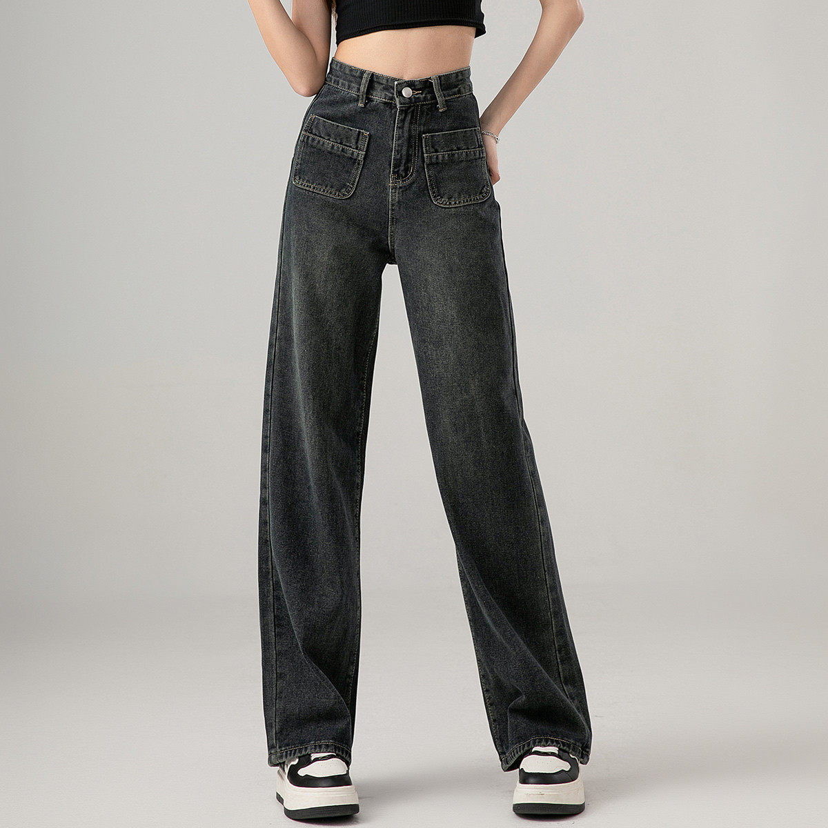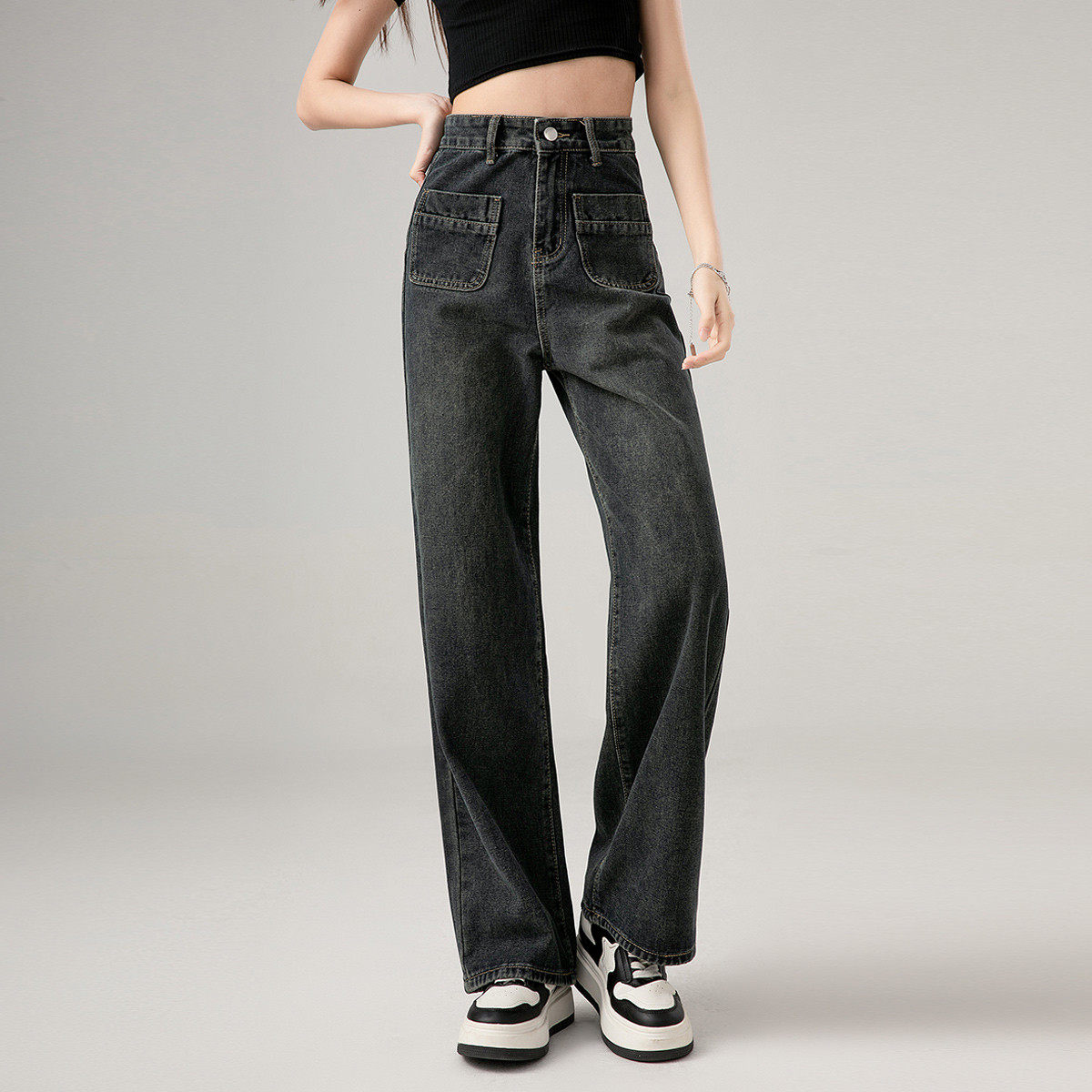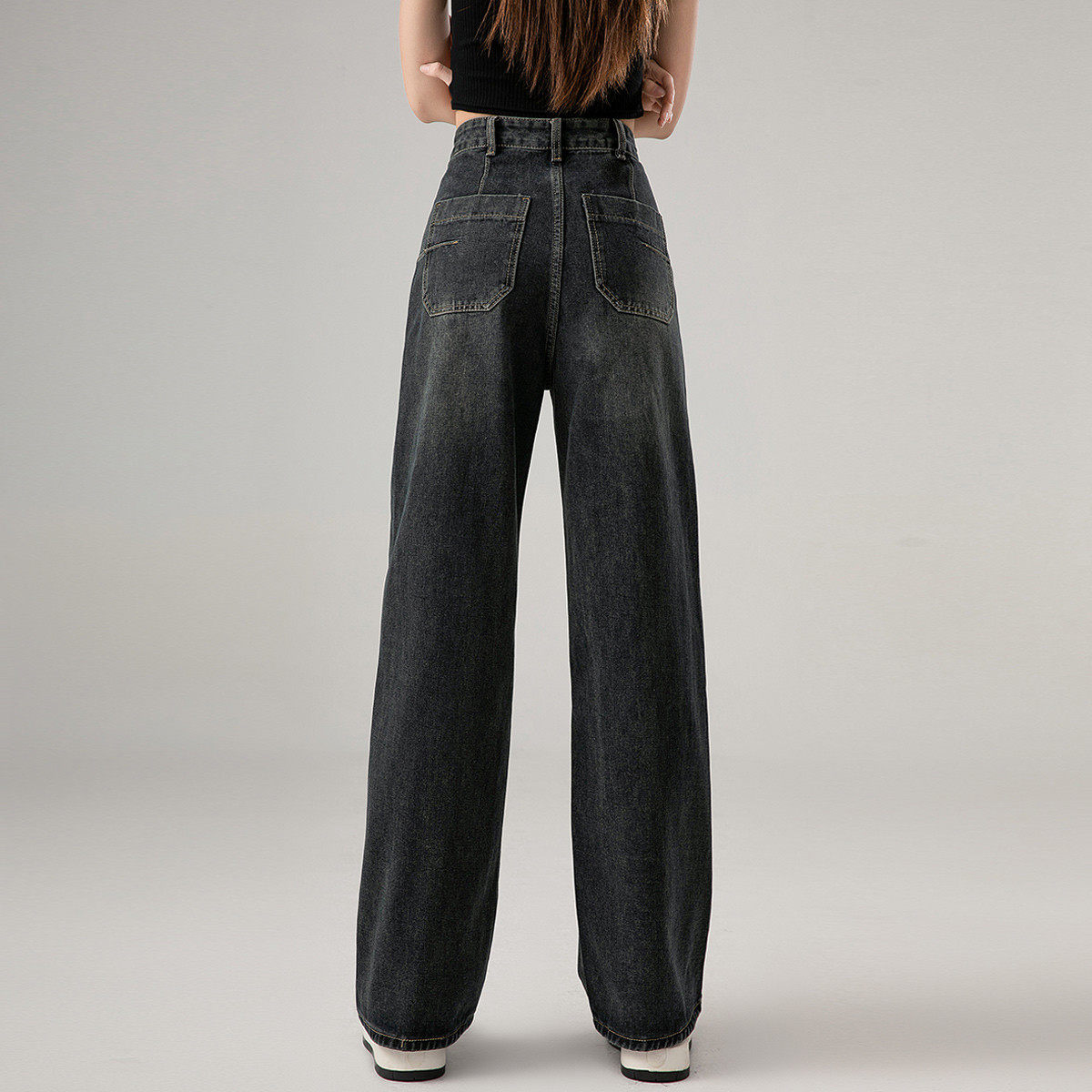 one more高腰阔腿牛仔裤女冬季2025港风复古坠感显瘦拖地裤直筒裤