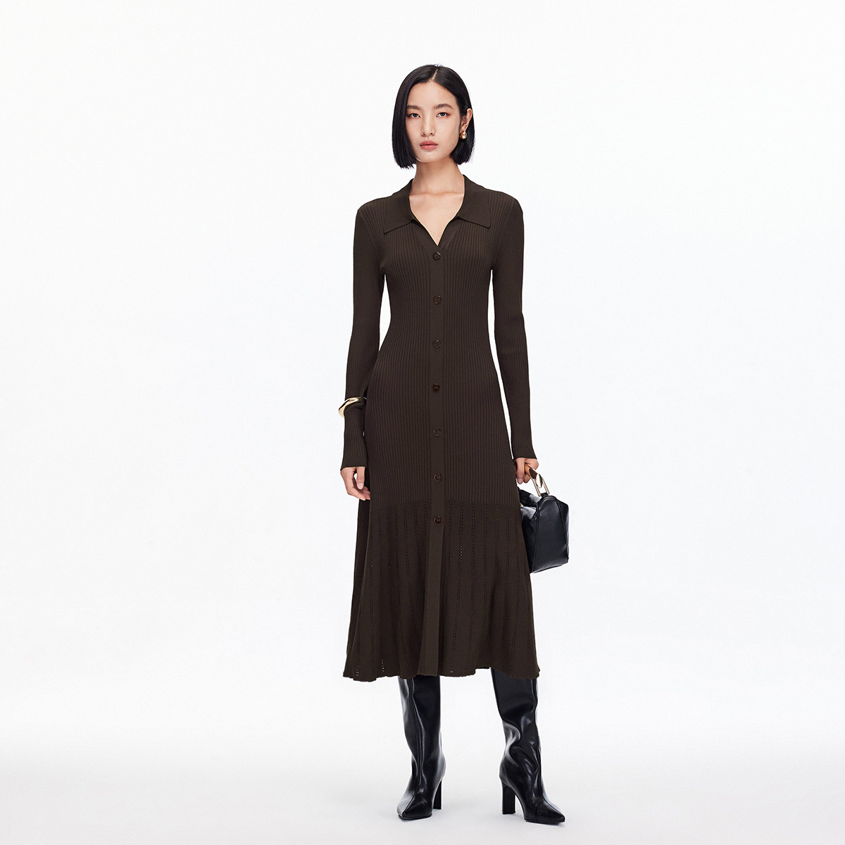 Vero Moda奥莱连衣裙女2025秋冬新款V领裙摆褶皱收腰针织长裙通勤