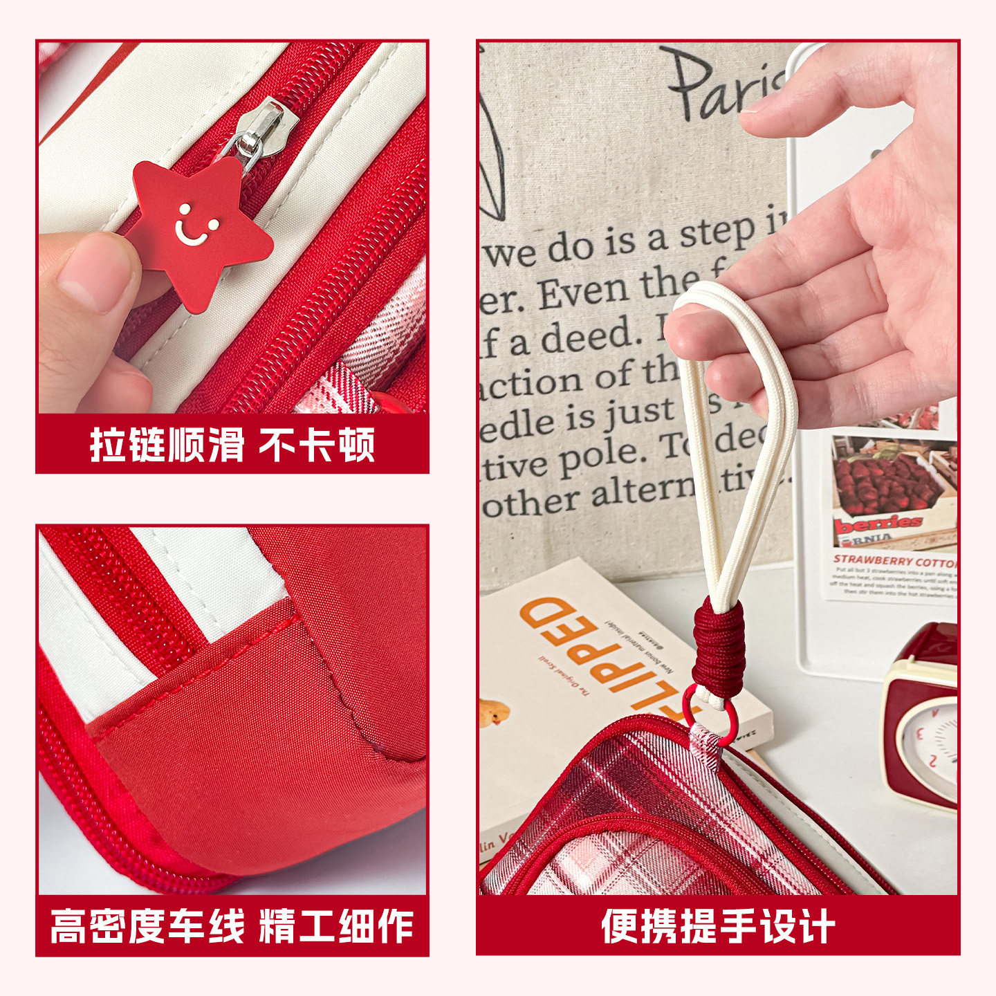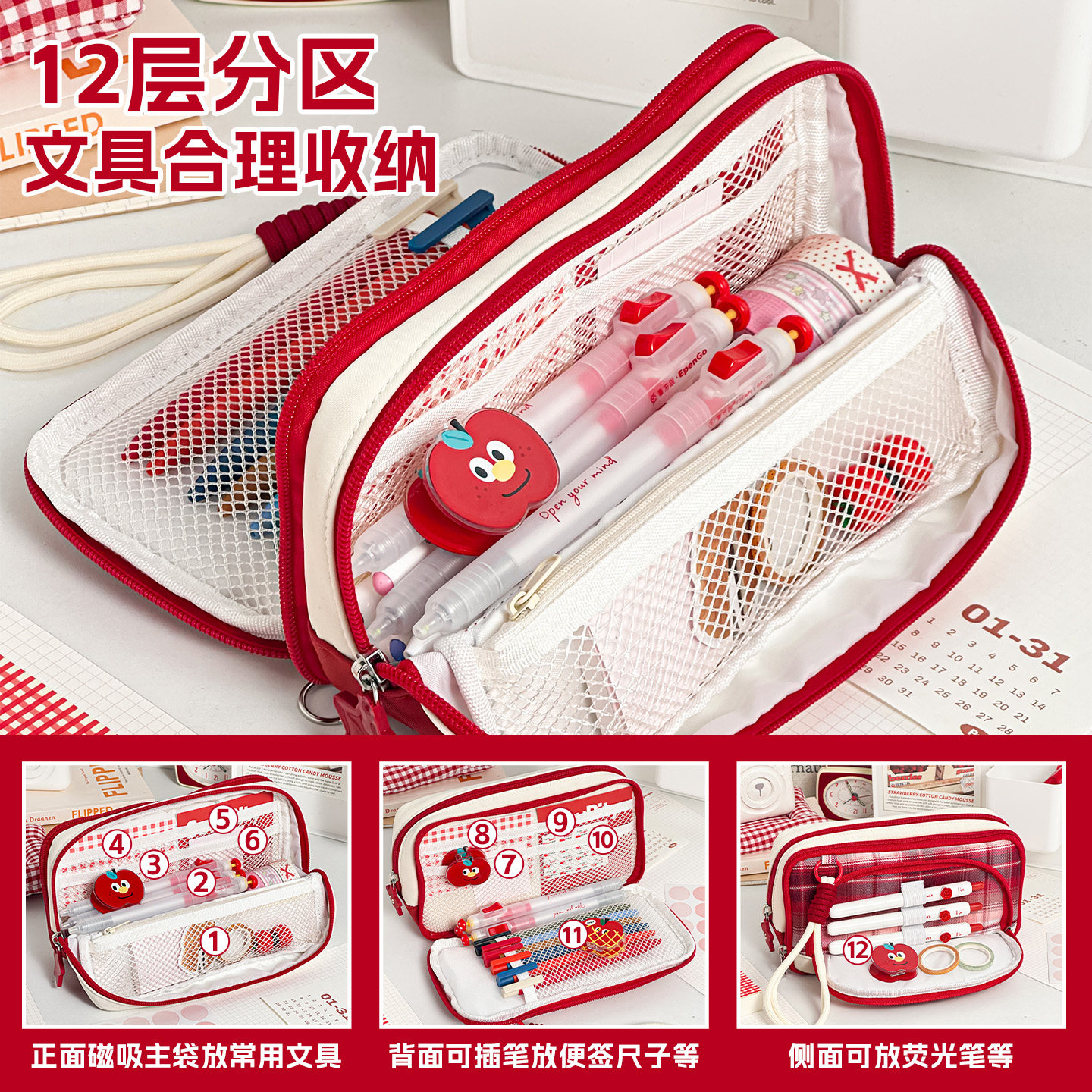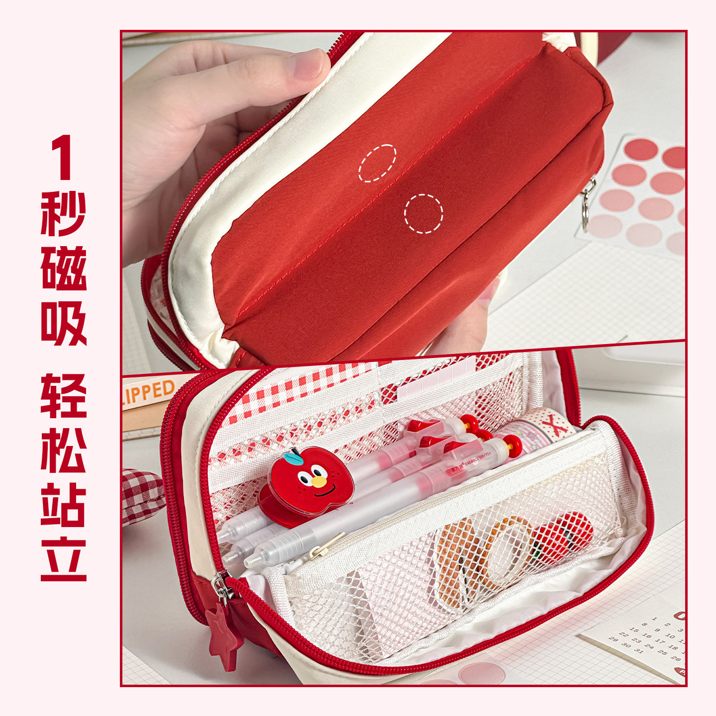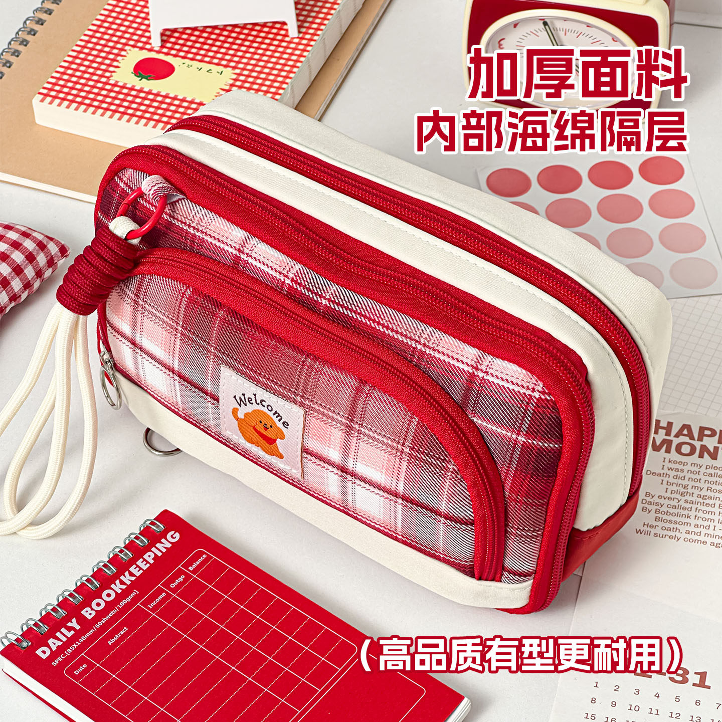 三年二班 格纹加厚笔袋2026新款女生高颜值ins风男孩大容量超火多层文具袋小众不撞款学霸磁吸便携立式小学生