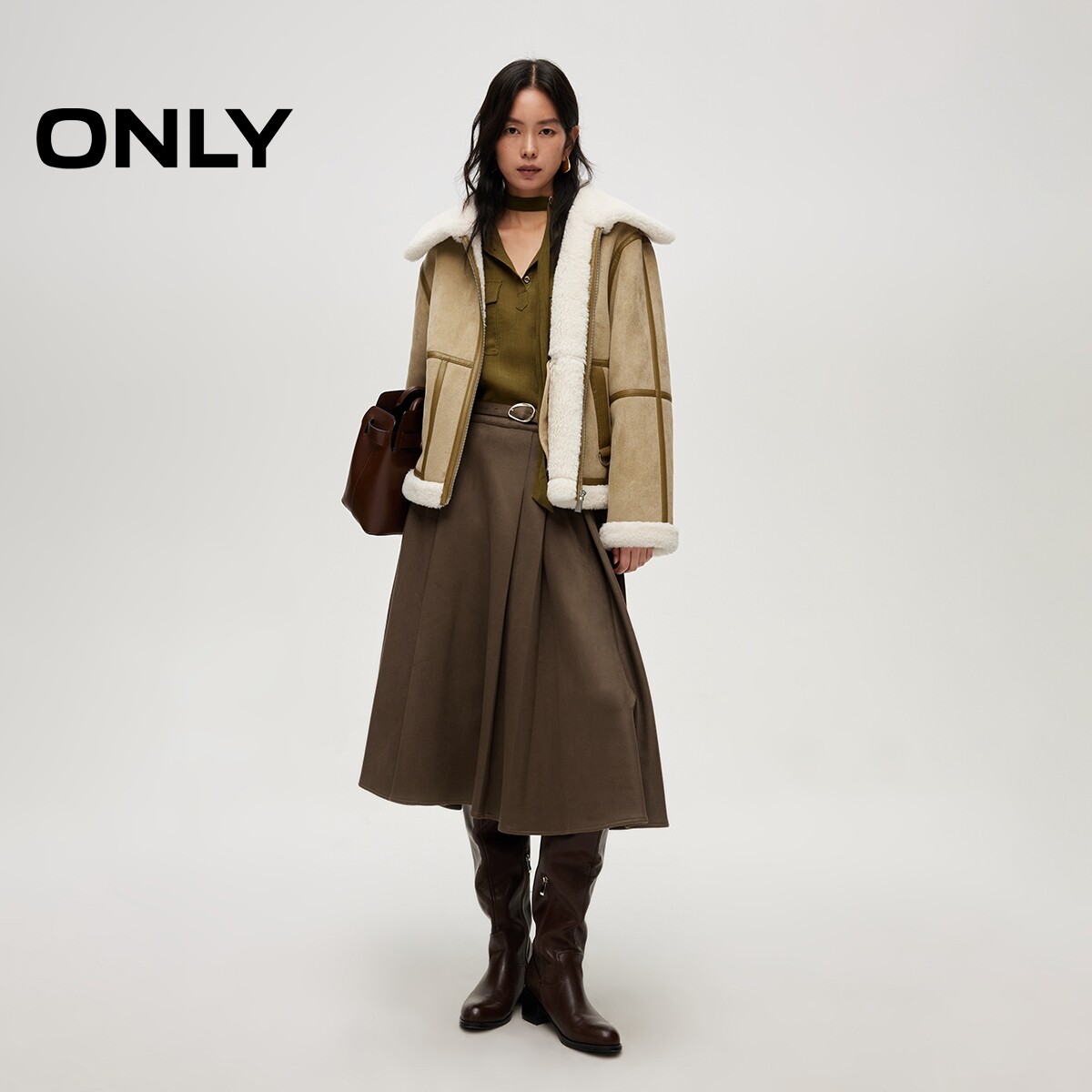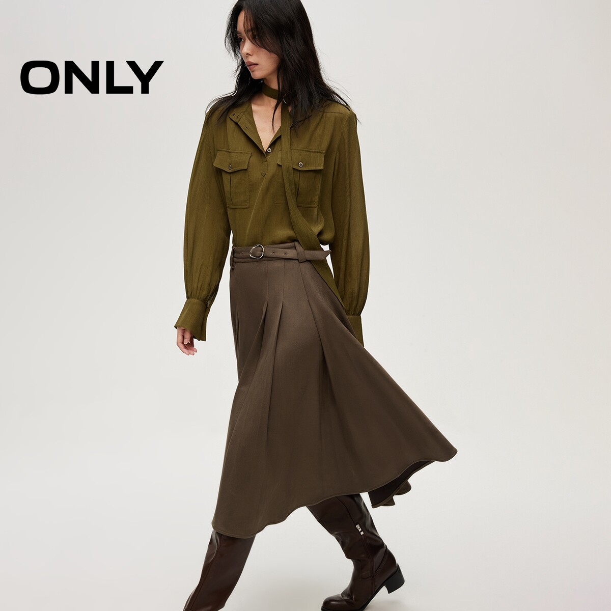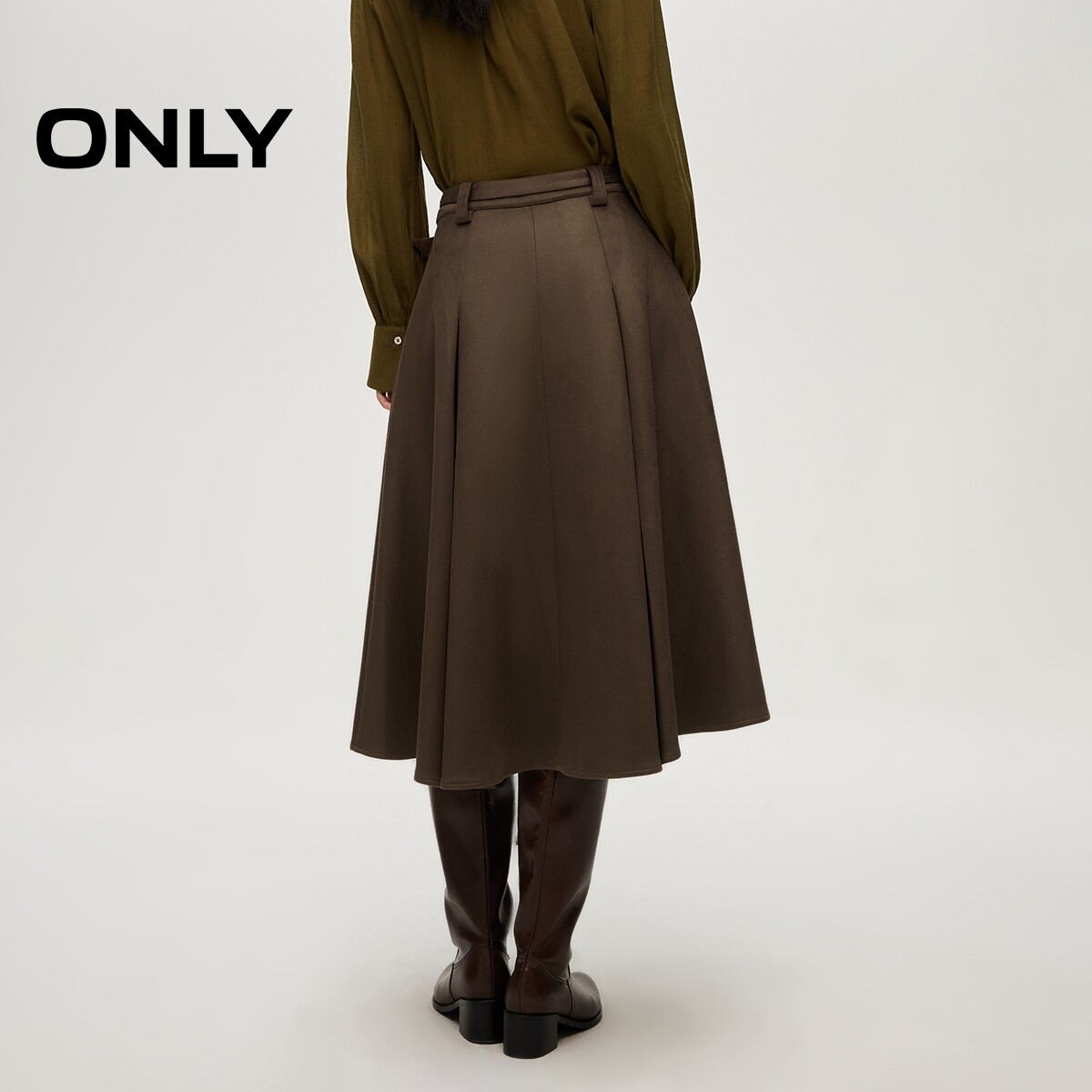 ONLY2026春季新款优雅气质垂感百褶腰带装饰伞裙中长裙半身裙女