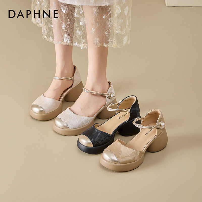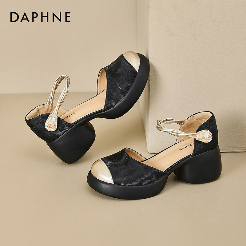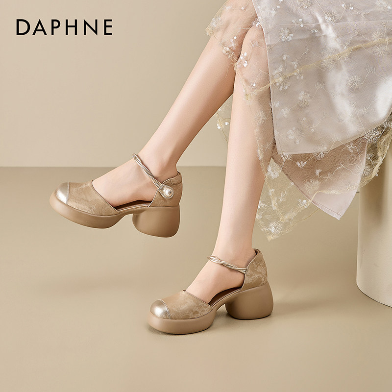 Daphne/达芙妮休闲百搭女舒适软底复古风粗跟圆头一字带时装凉鞋
