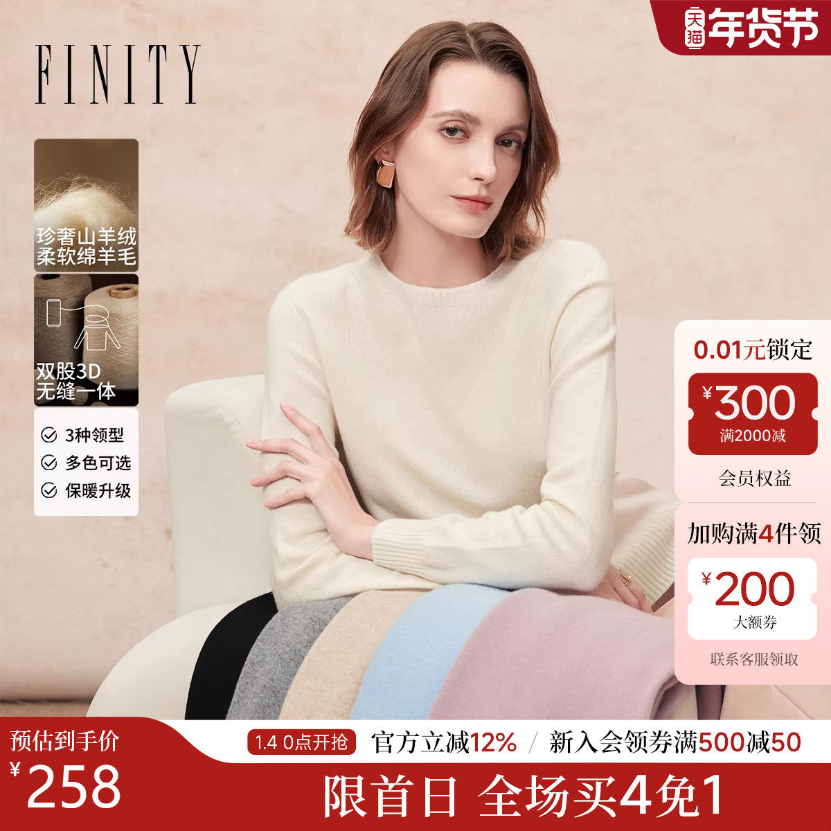 FINITY菲妮迪羊绒衫2025年冬季新款绒感圆领无缝一体针织毛衣女