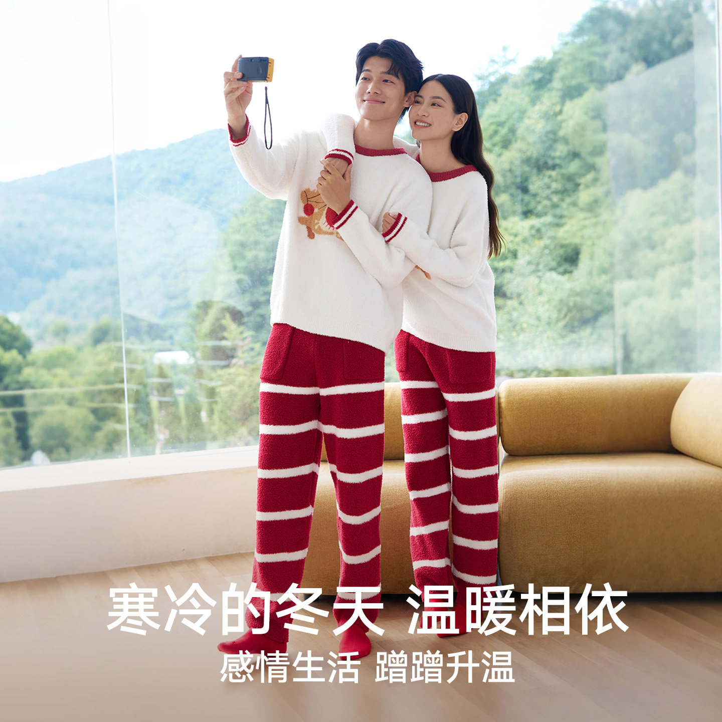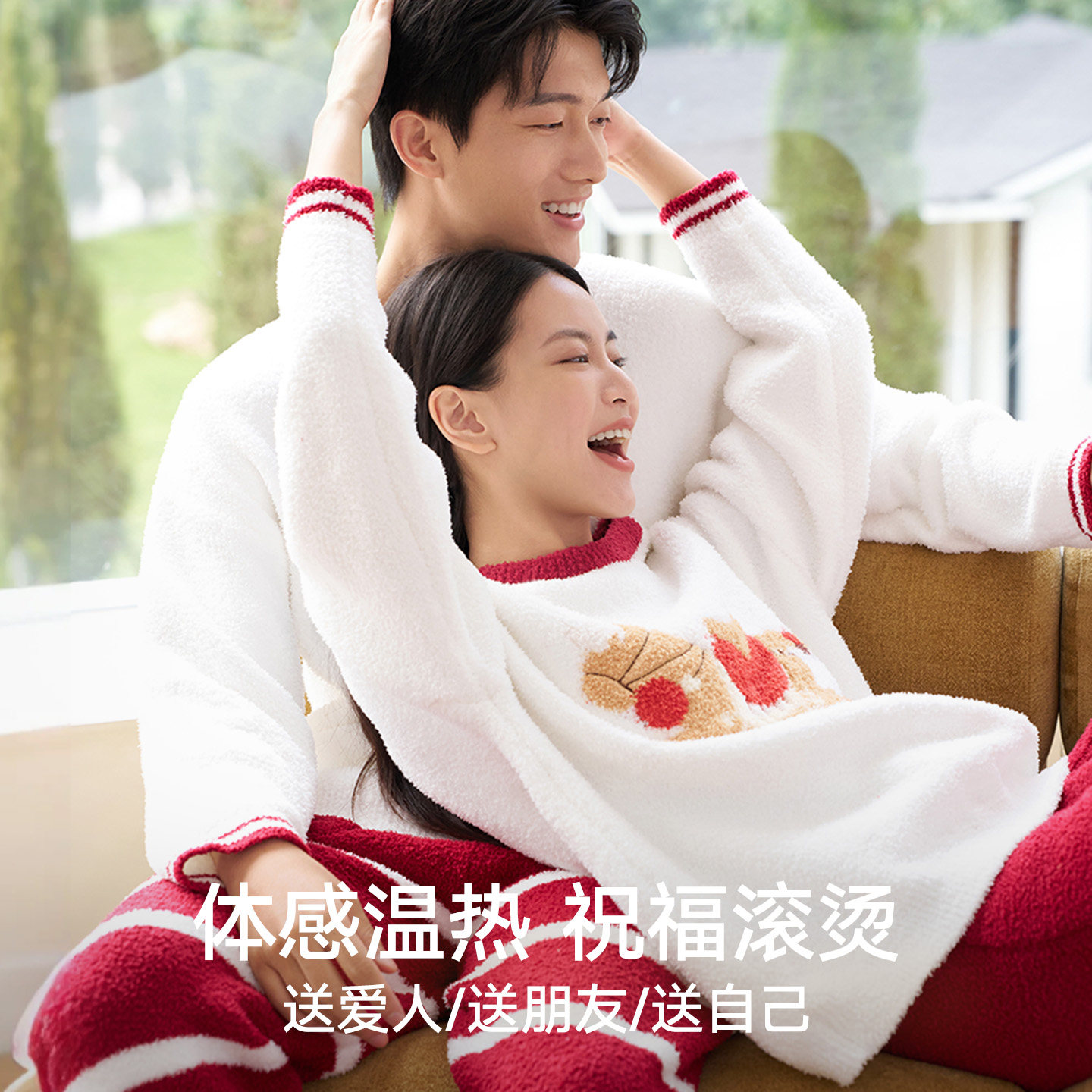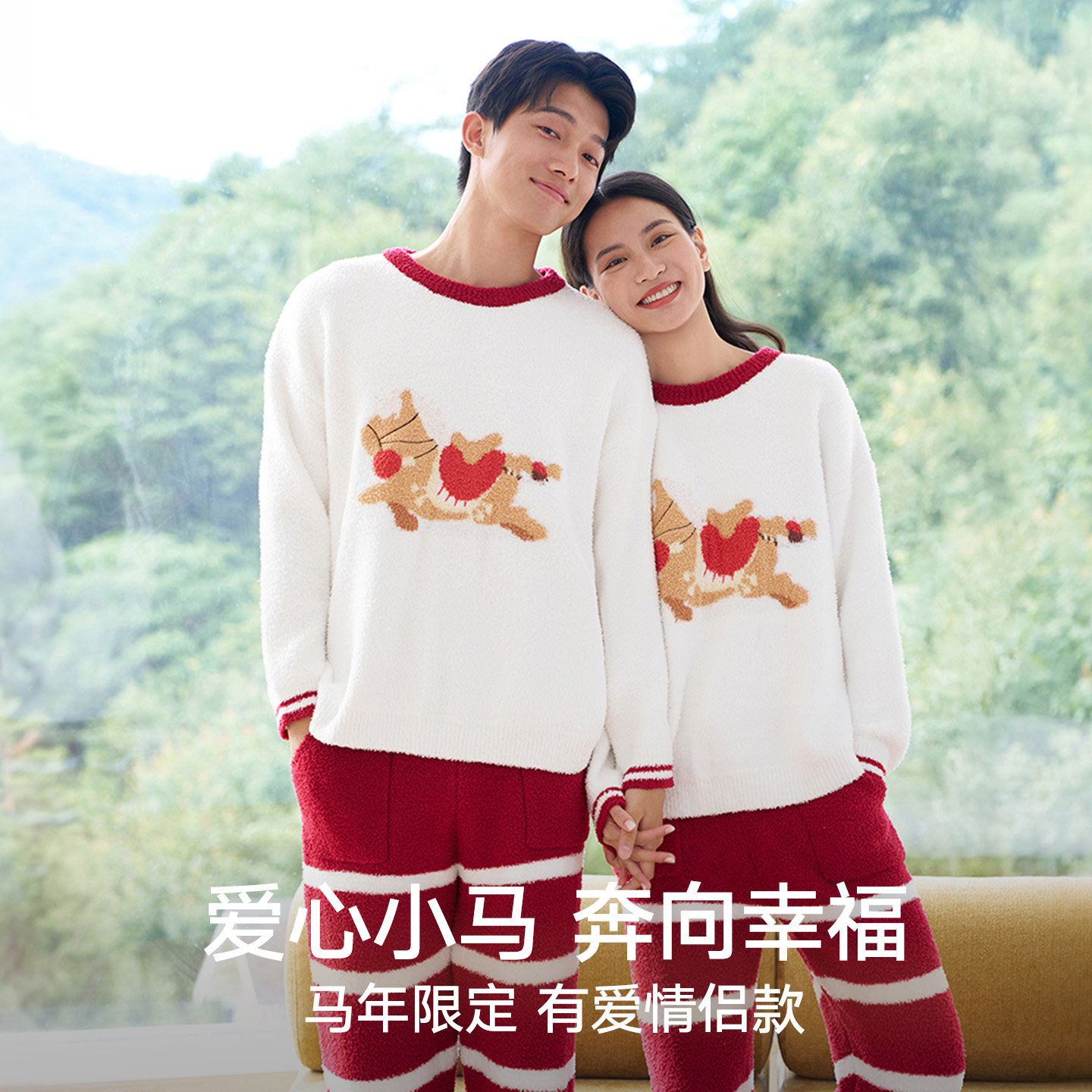 松山福松山棉店马年红色半边绒情侣家居服套装本命年长袖睡衣男女