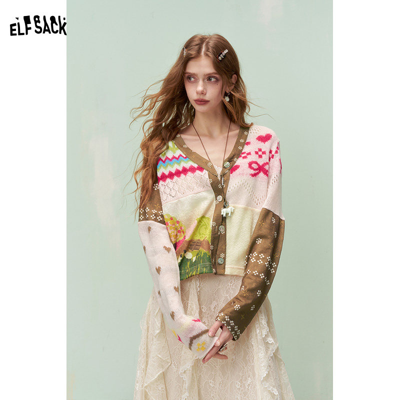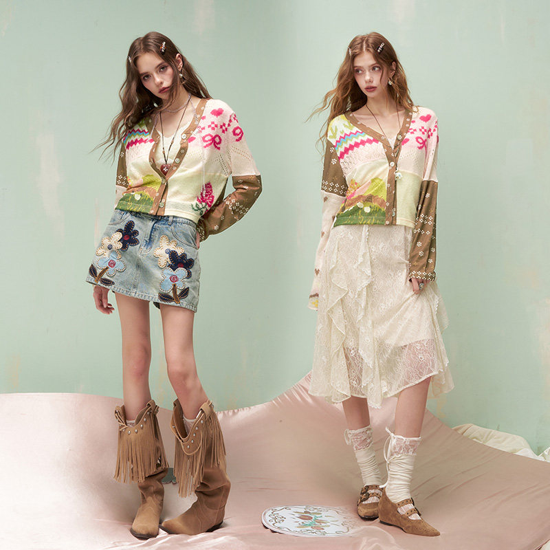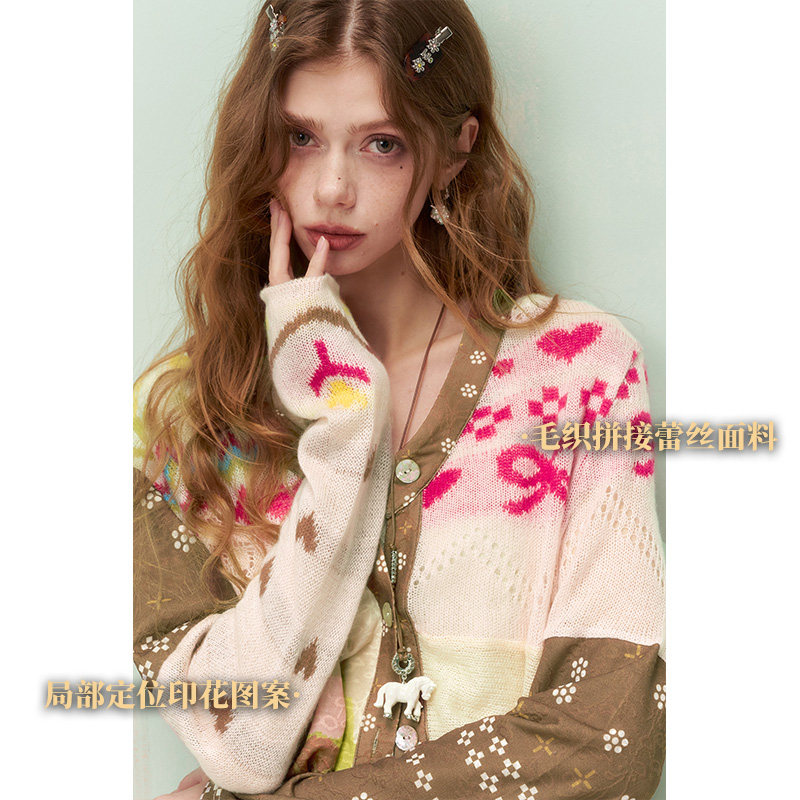 妖精的口袋撞色拼接印花针织开衫女2026年早春新款设计感小众上衣