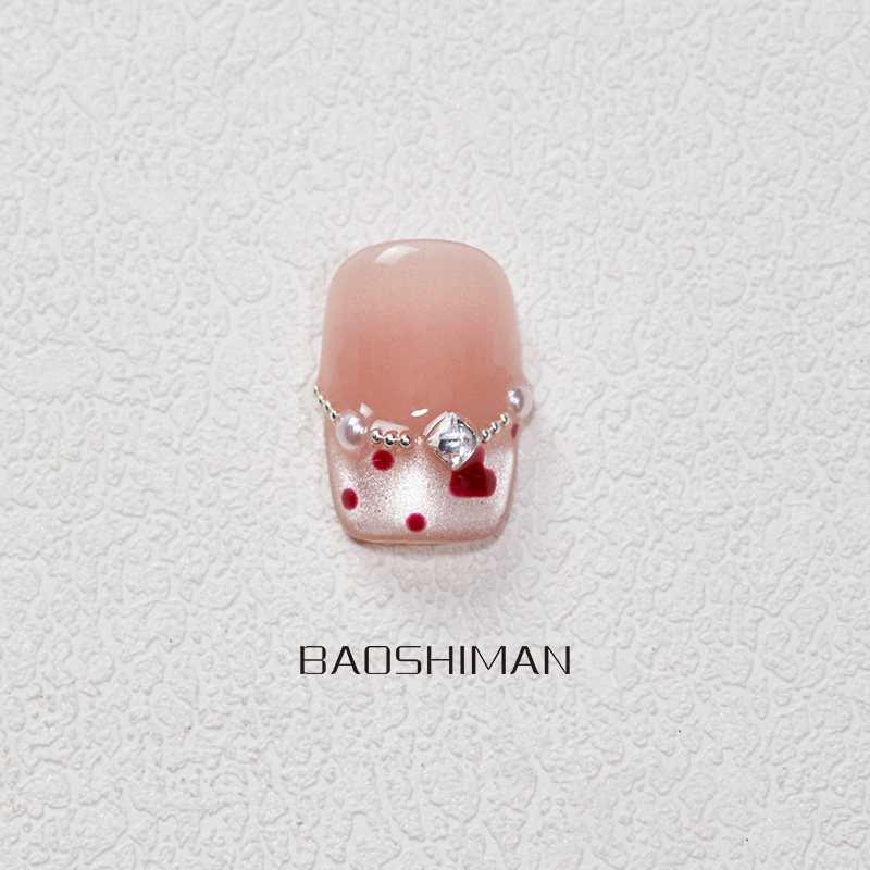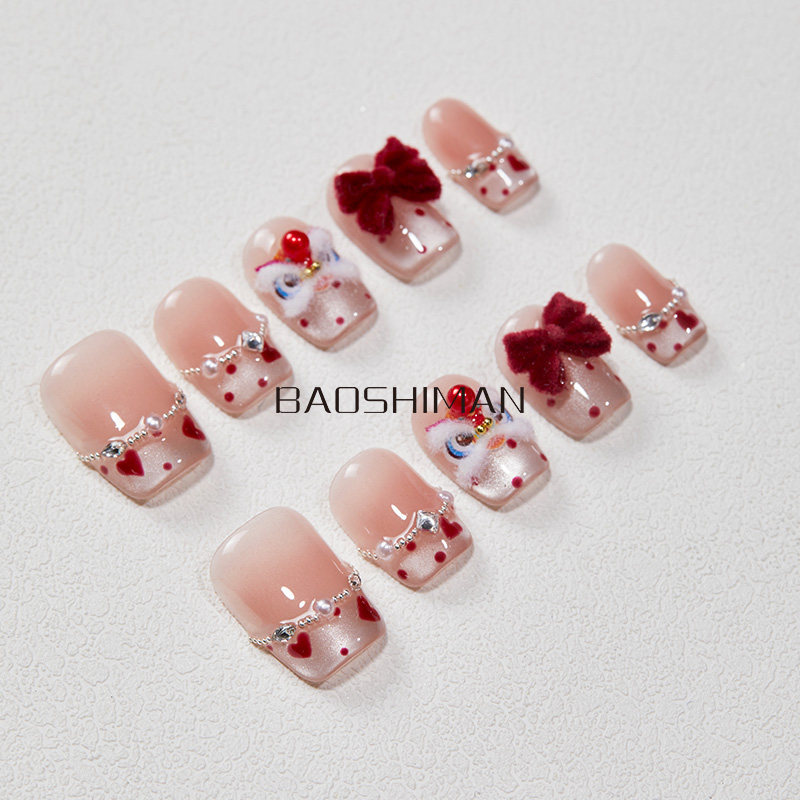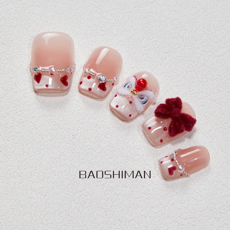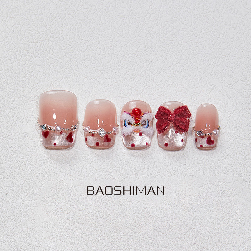 新年醒狮纯手工穿戴甲立体国风红色显白高级可拆卸美甲ins风波点