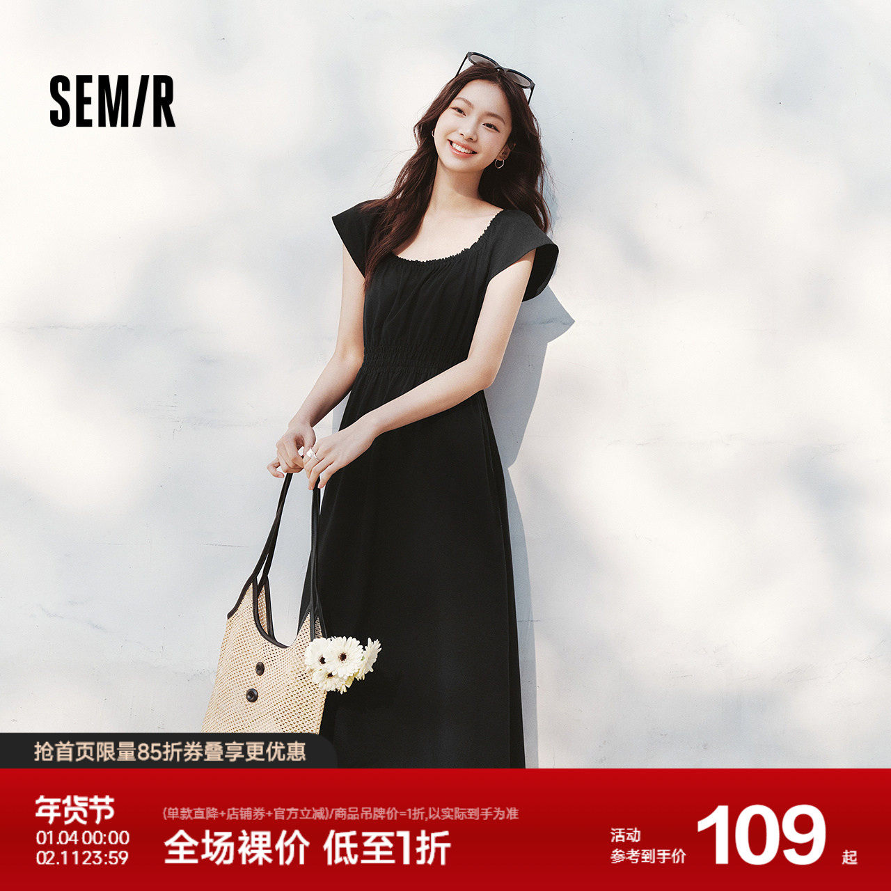 森马连衣裙女镂空收腰小心机2025夏新款小飞袖一字肩中长裙小性感