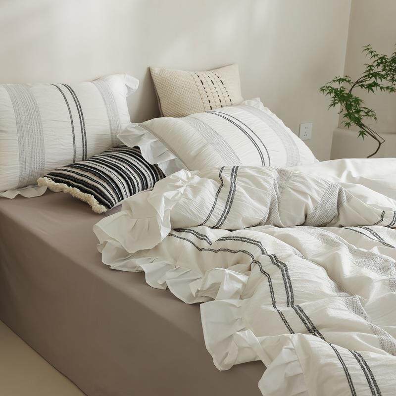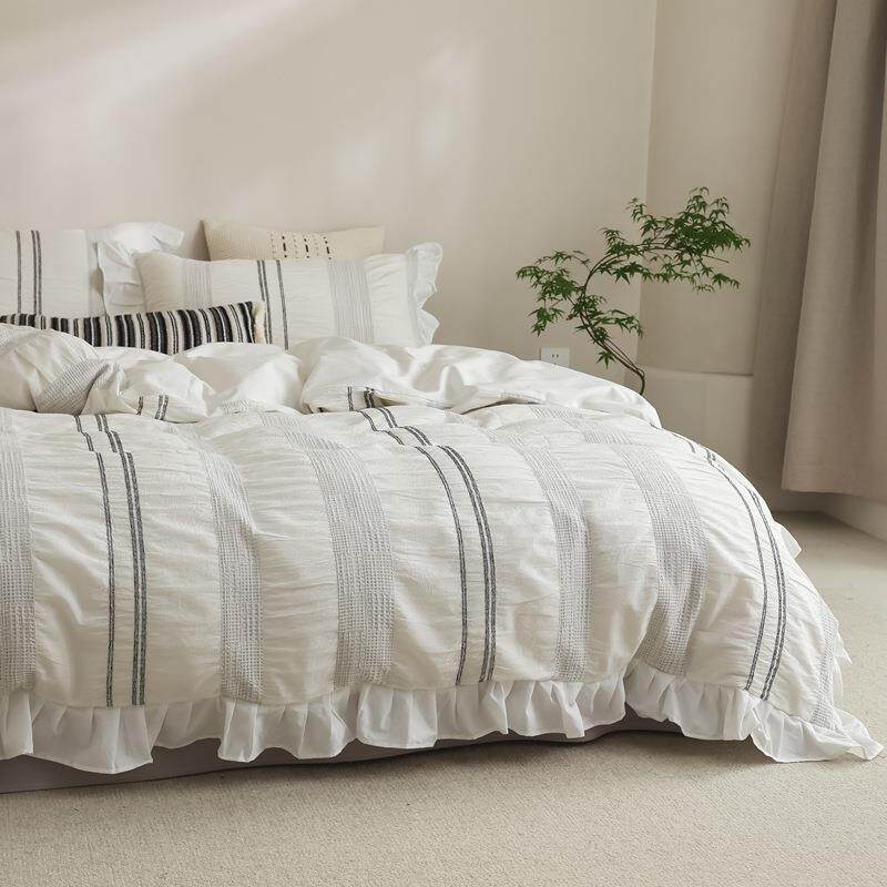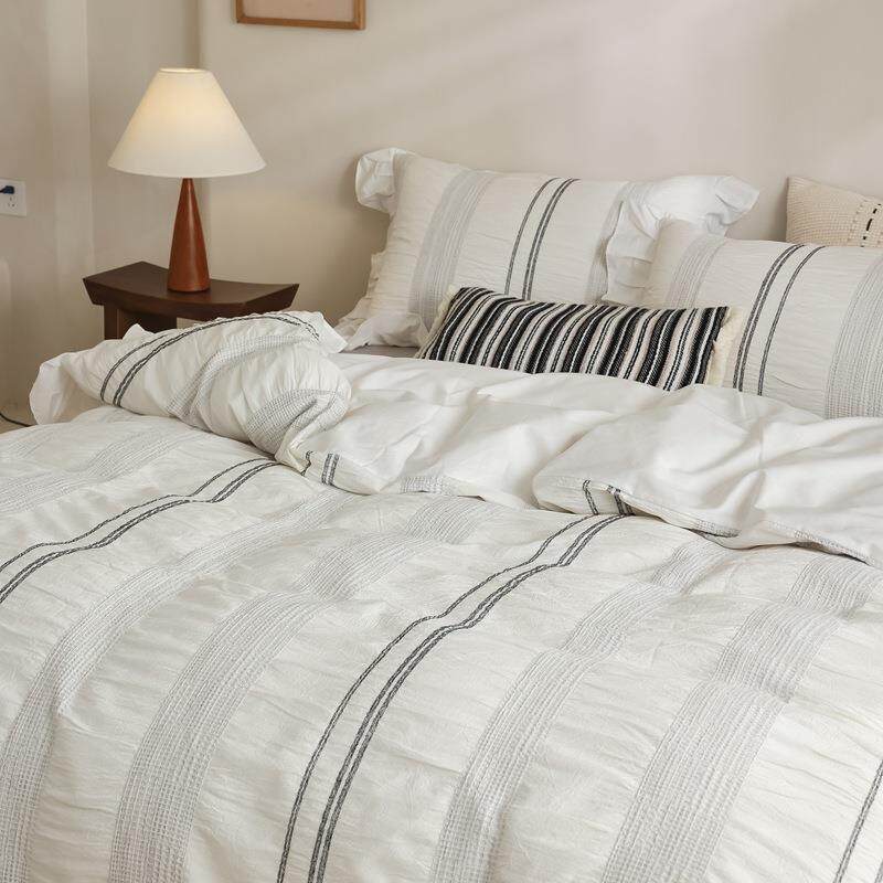 日式水洗皱皱纱简约色织提花线条感全棉四件套水洗棉纯棉床上用品