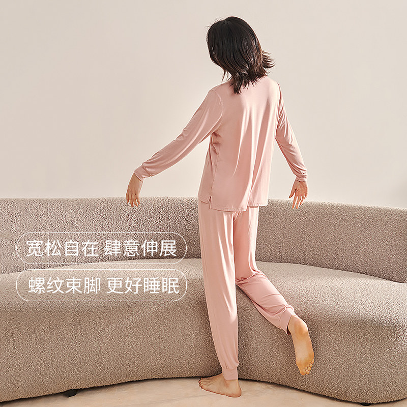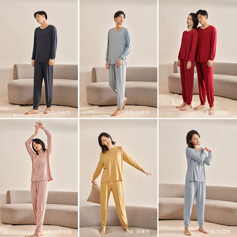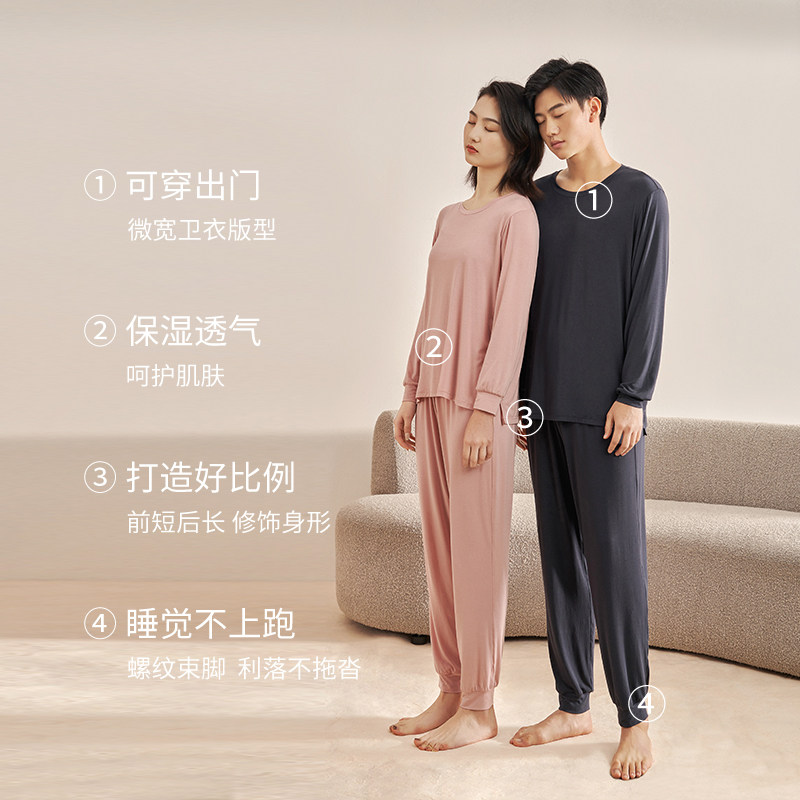 觅丝【裸感】莫代尔天丝睡衣女秋冬大码长袖情侣男士家居服套装