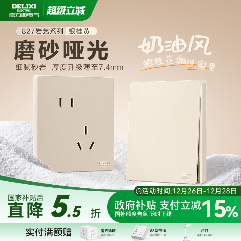 德力西旗舰店827奶油风哑光开关五孔插座空调16A面板银桂黄