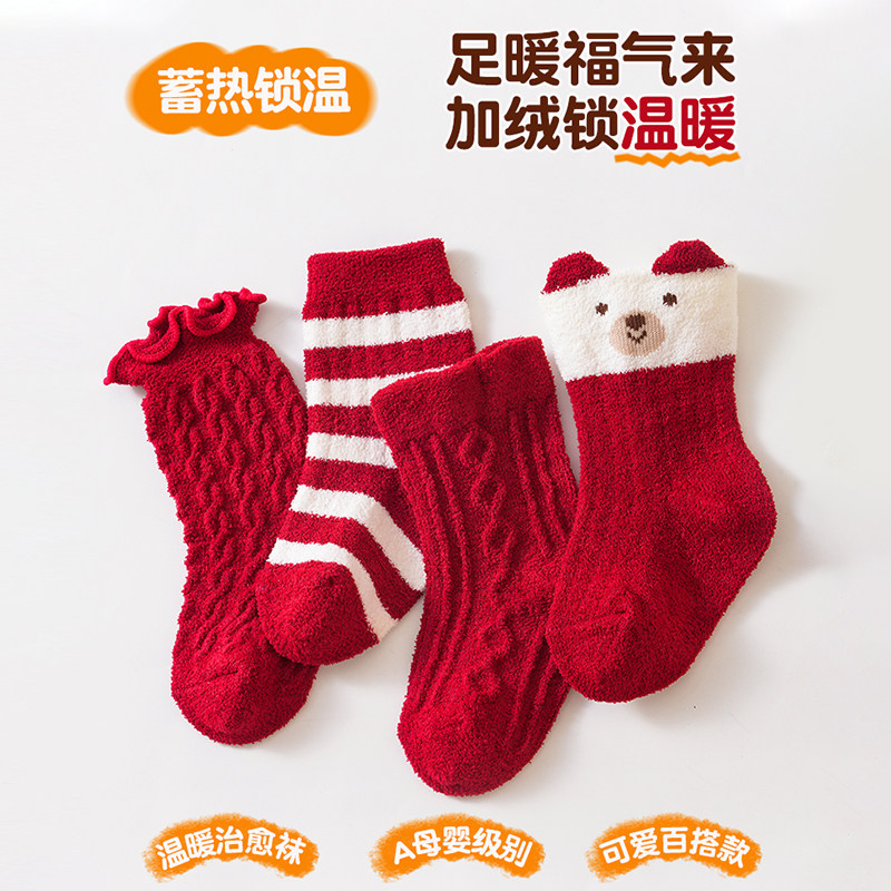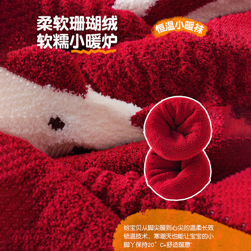 宝宝新年袜儿童秋冬加厚珊瑚绒保暖袜婴儿中筒袜不勒腿红色加绒