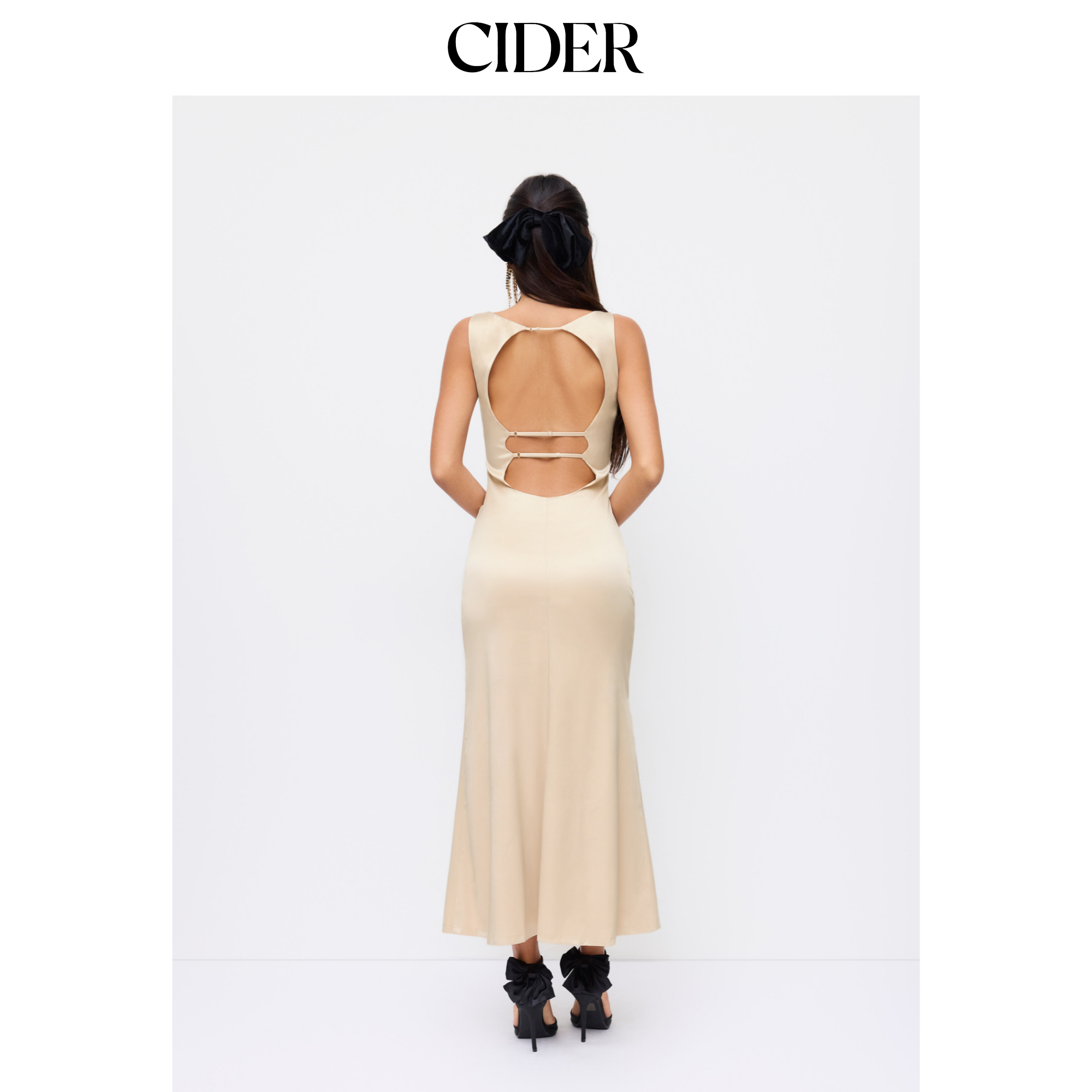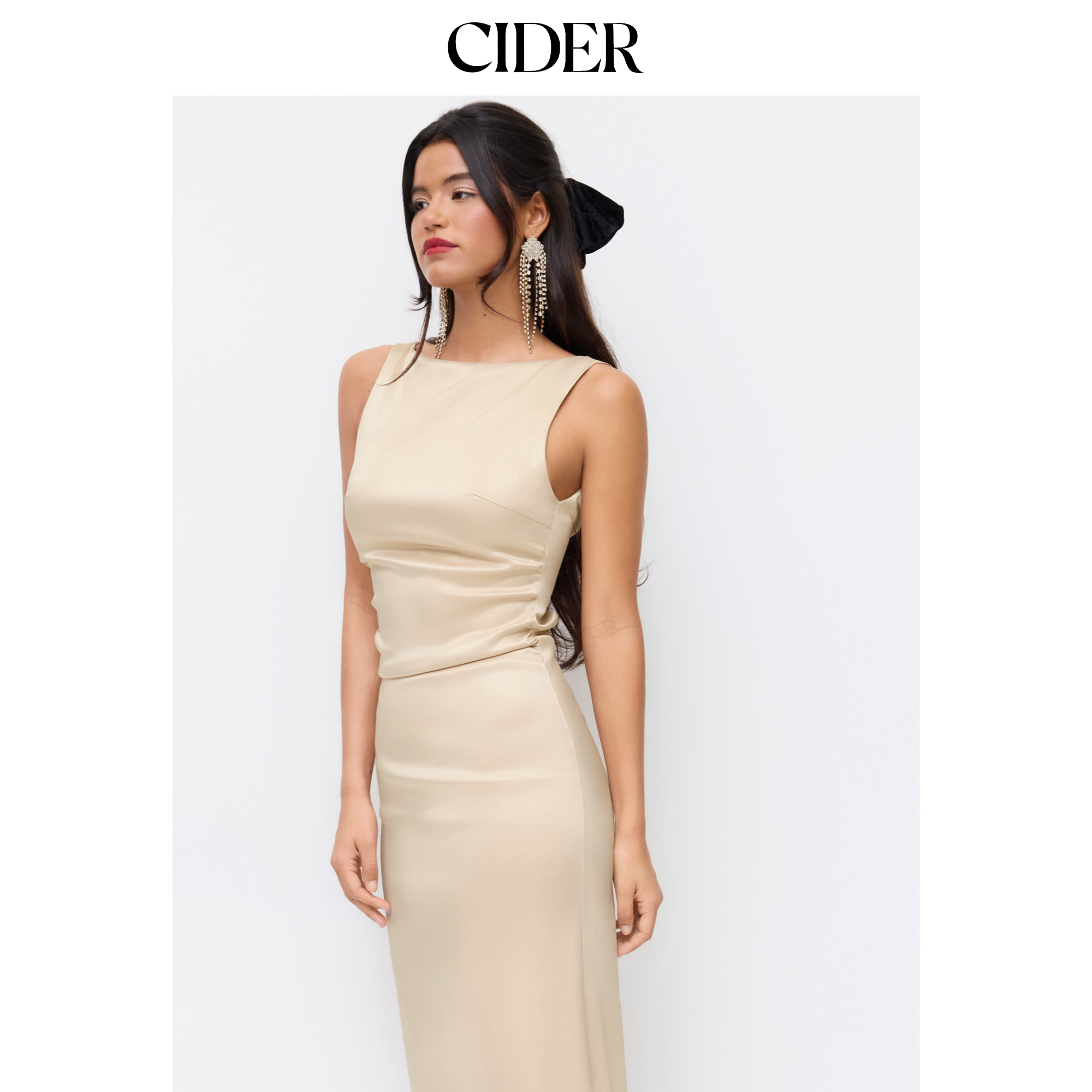 CIDER缎面船领露背连衣裙无袖背心裙不规则收腰褶皱长裙114393470