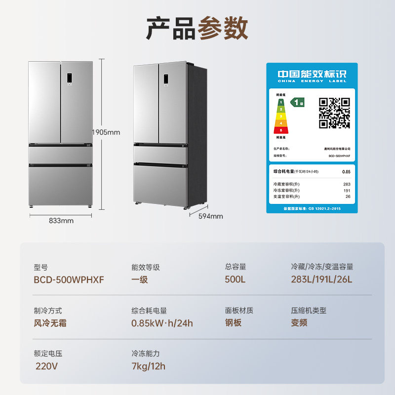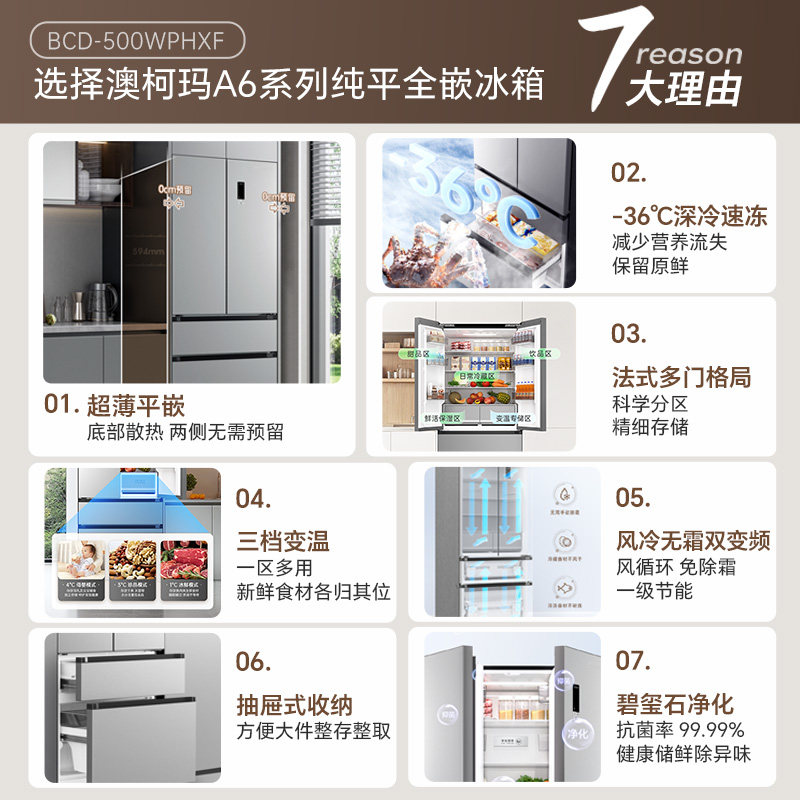 深594澳柯玛500L超薄平零嵌入法式四门家用冰箱-36深冷