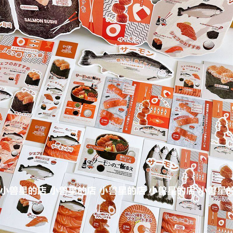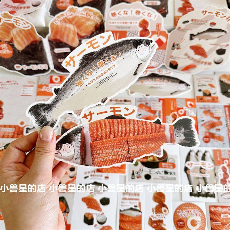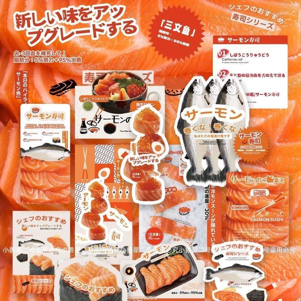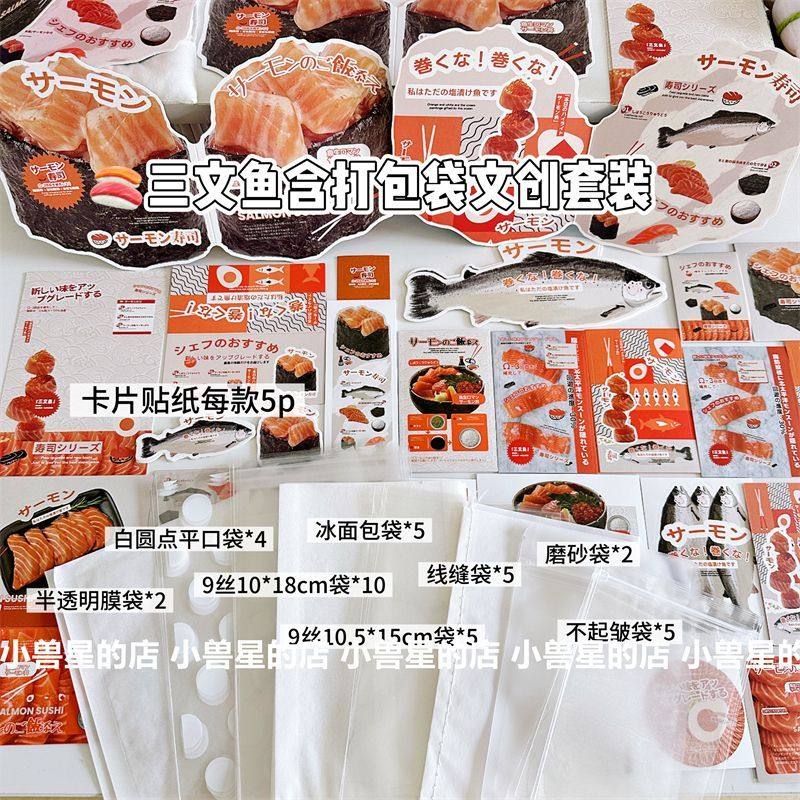 原创 D家三文鱼文创美食打包材料套装高颜值出卡折页卡头贴纸封口