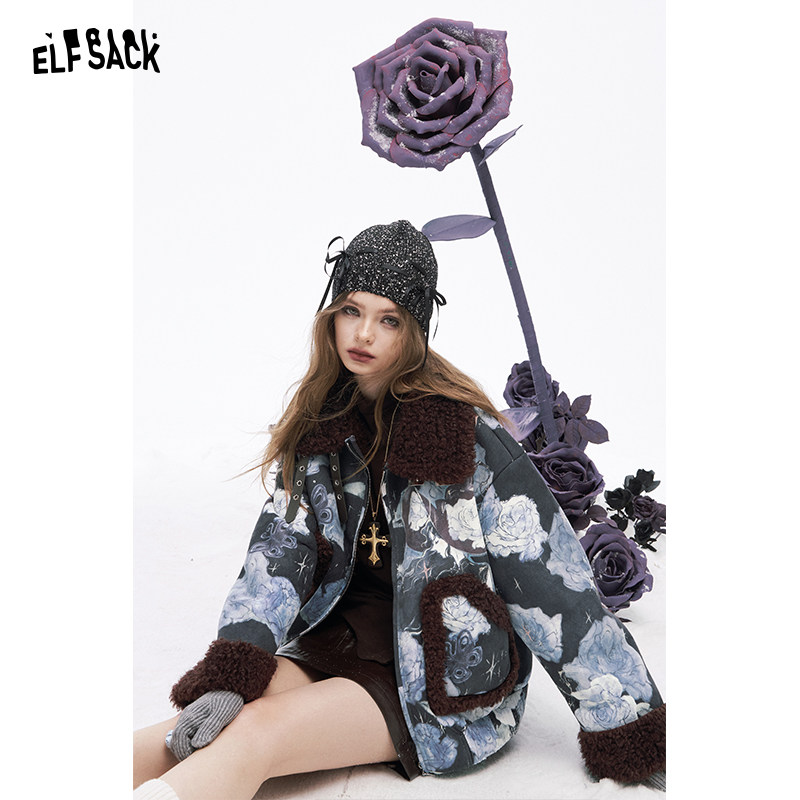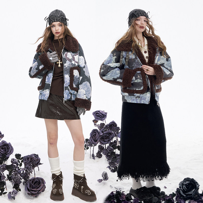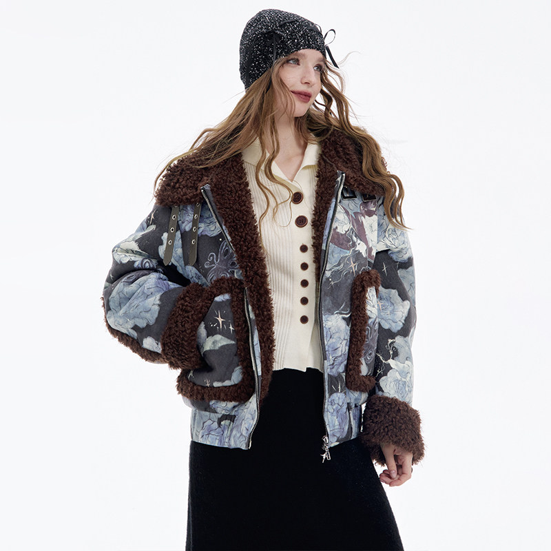 妖精的口袋复古印花皮毛一体短款毛呢外套女2025冬新款小个子保暖