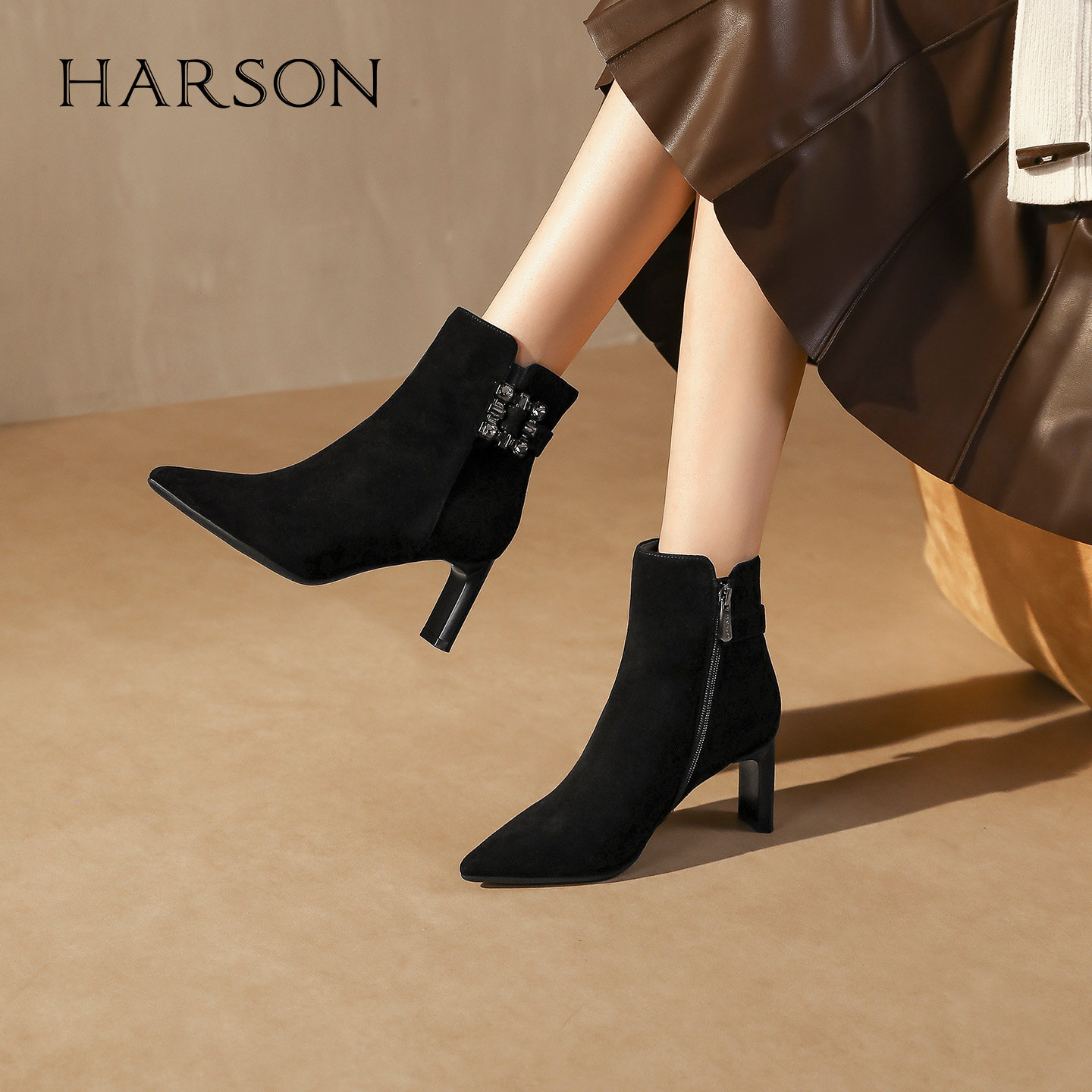 哈森尖头粗高跟时装短靴女秋冬新款羊皮侧拉链短筒女靴 HA227175