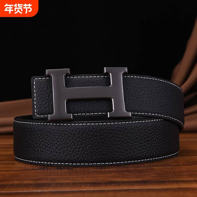 爱马男仕真皮男士字母商务高端皮带平滑扣牛皮中青年年轻人铜扣奢