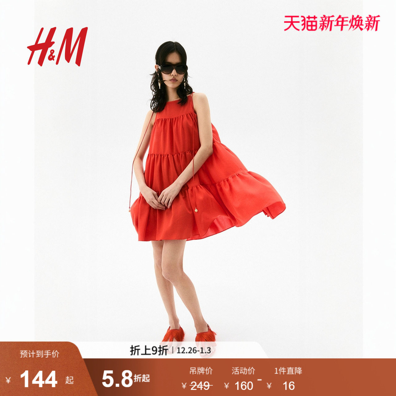 HM女装吊带连衣裙2025年新款气质亮红色通勤分层A字连身裙1294305