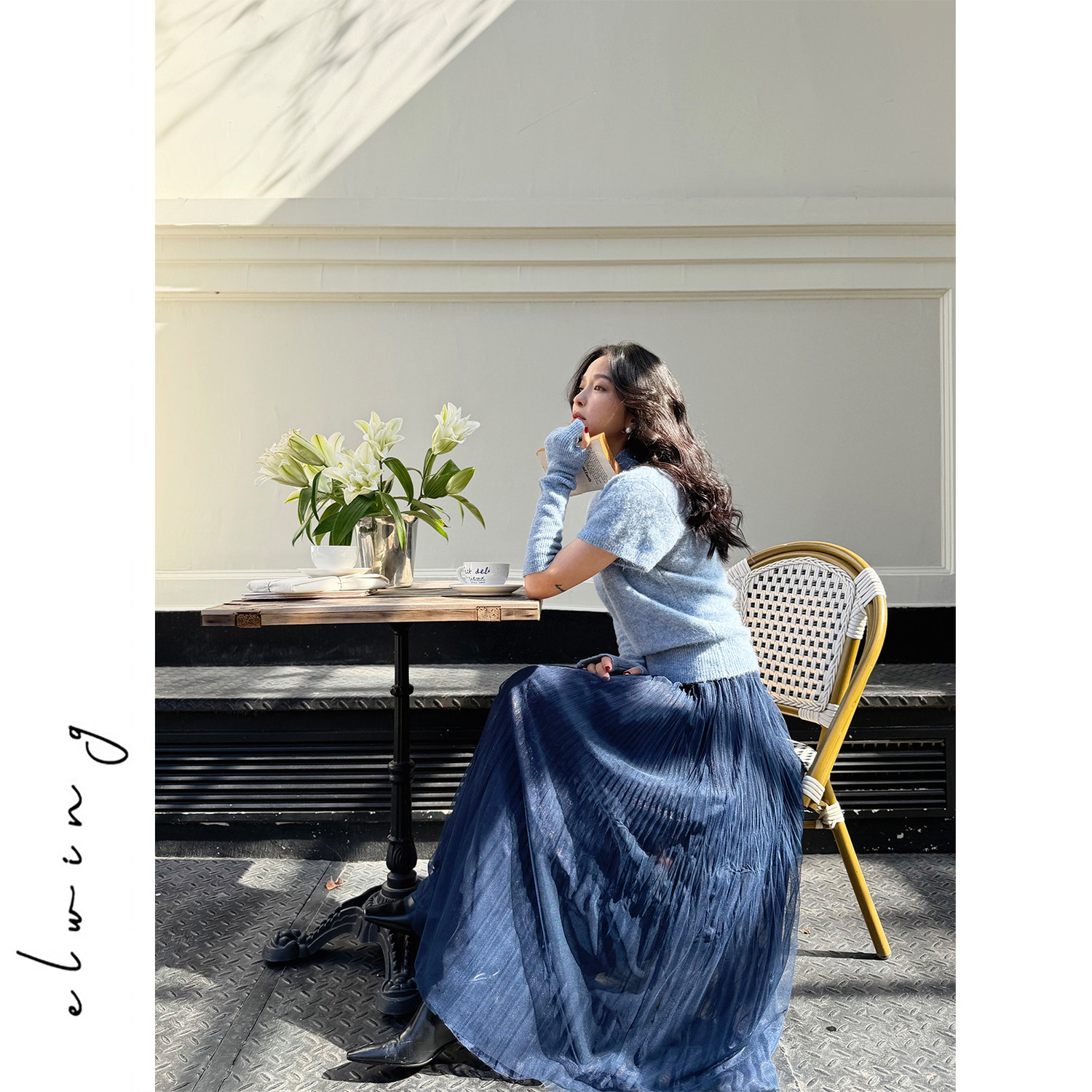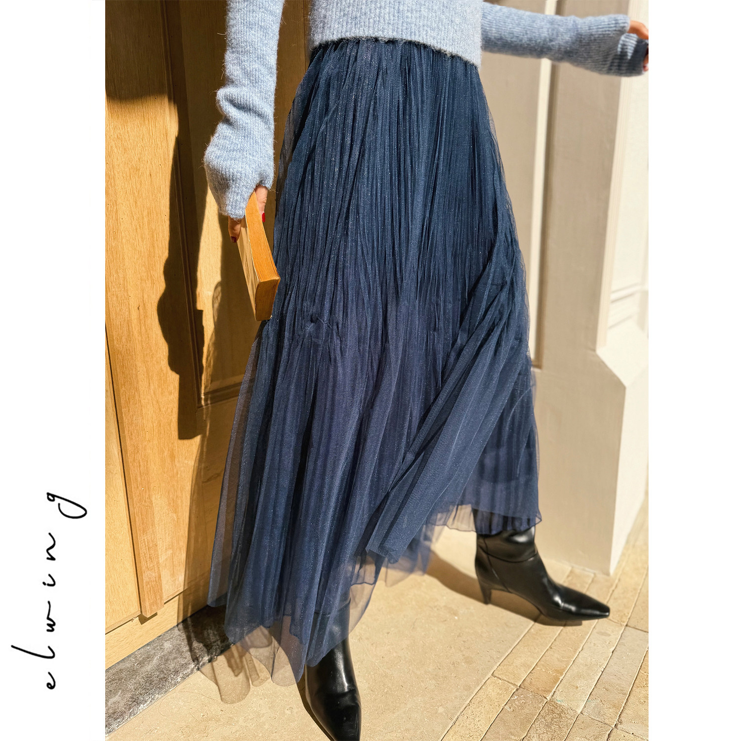 Elwing原创细闪鎏金飘逸重工压褶中长款大摆A字纱裙半身裙