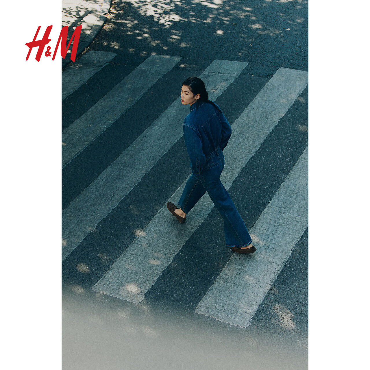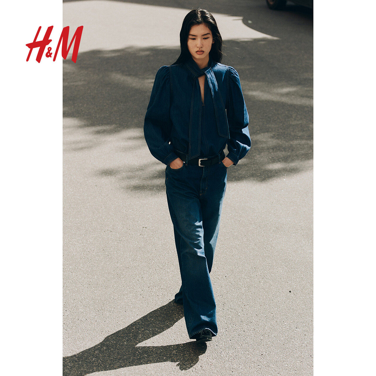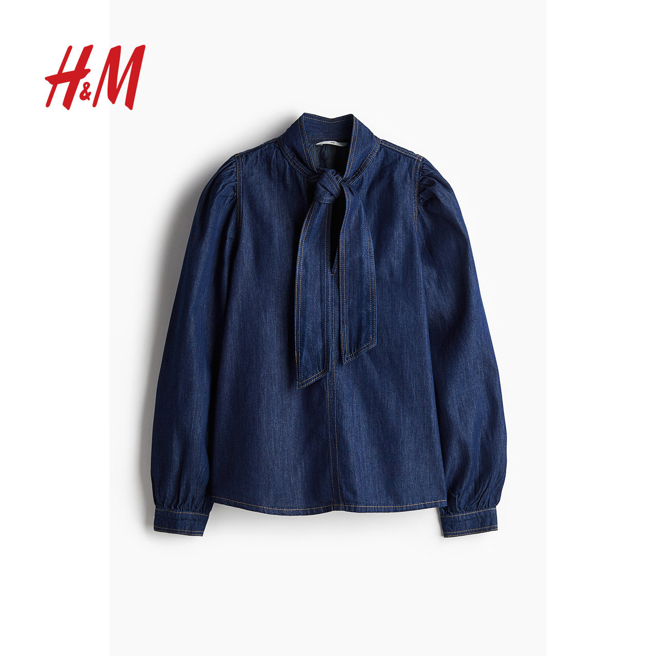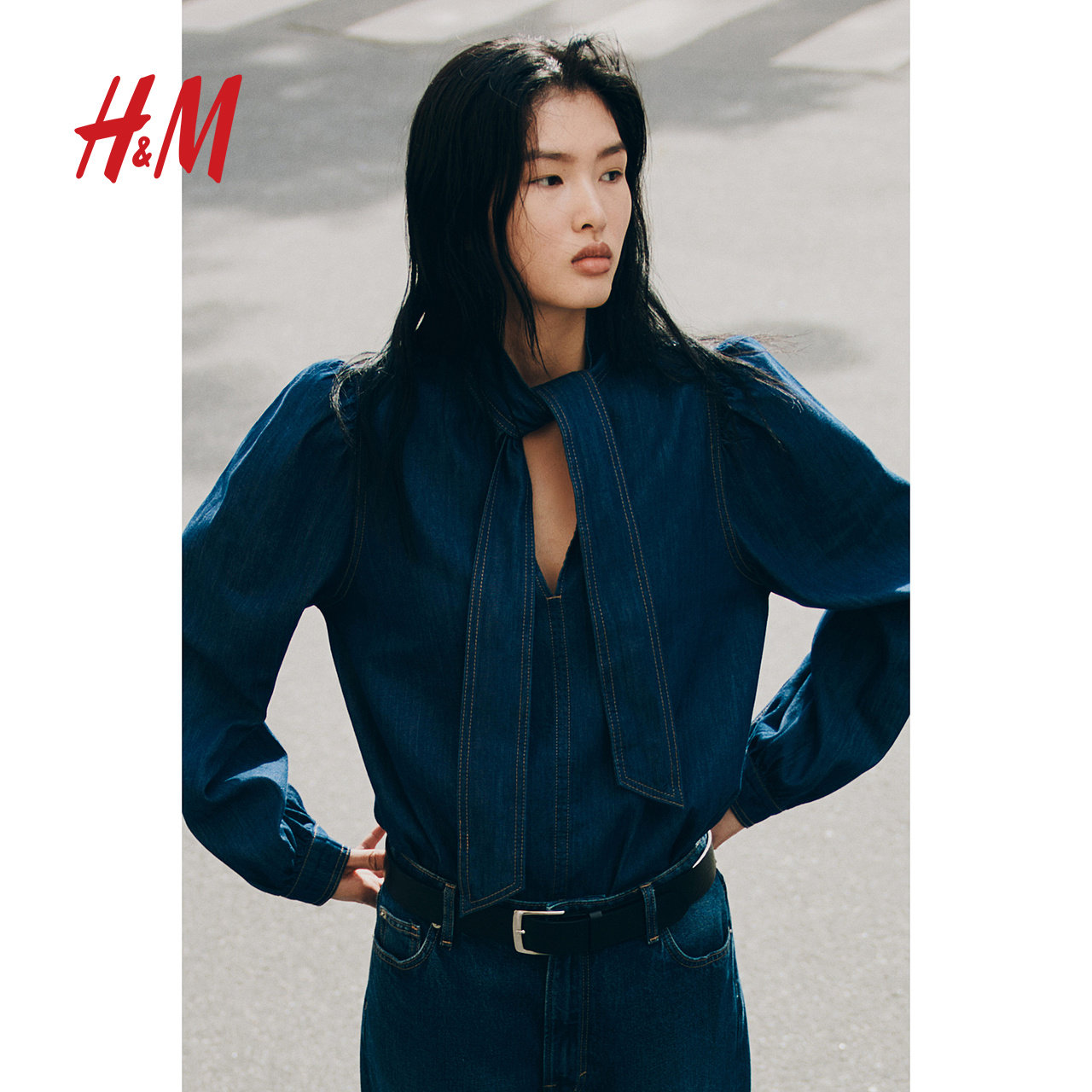 HM女装衬衫冬季女士休闲复古领口系带牛仔上衣1241806