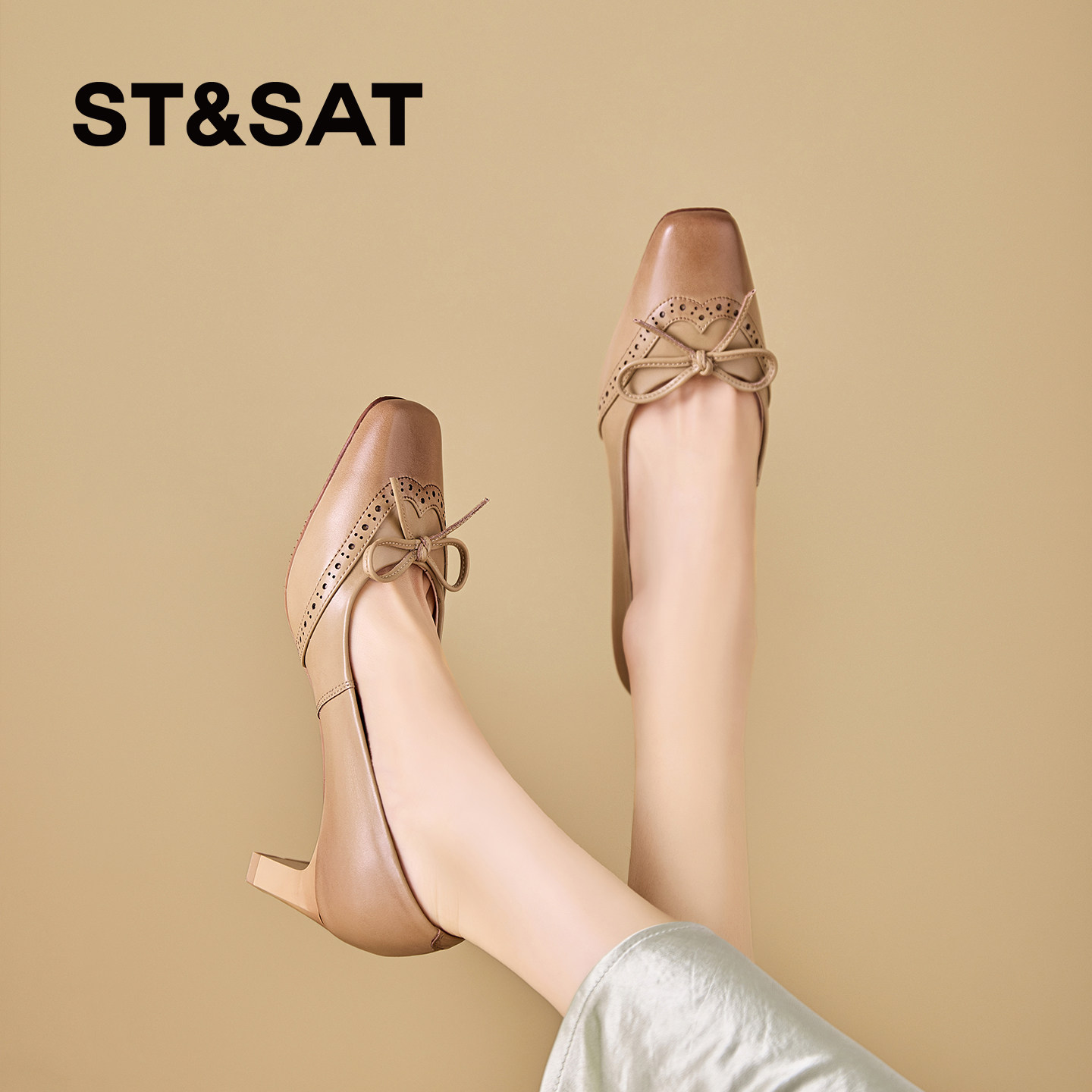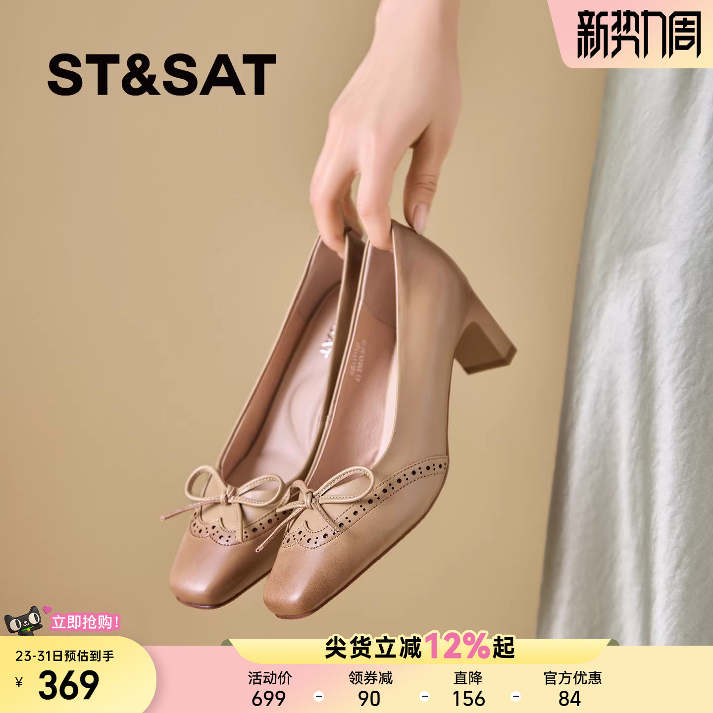 星期六粗跟单鞋女2026法式通勤风方头浅口蝴蝶结粗跟布洛克高跟鞋