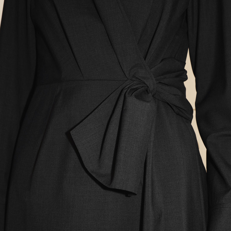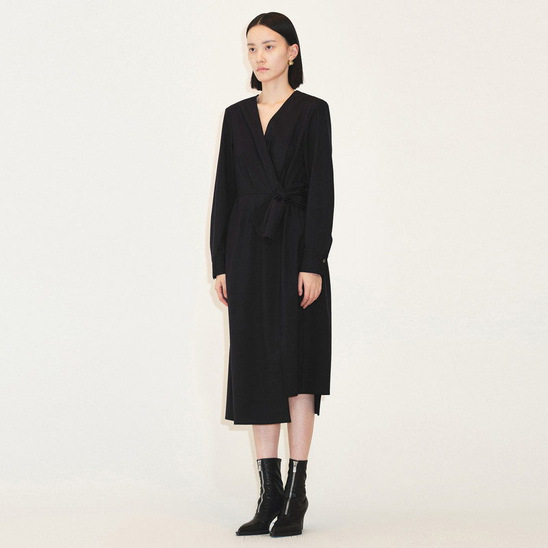 LESS春季绵羊毛裙子女气质收腰开叉V领中长款连衣裙2N1G10720