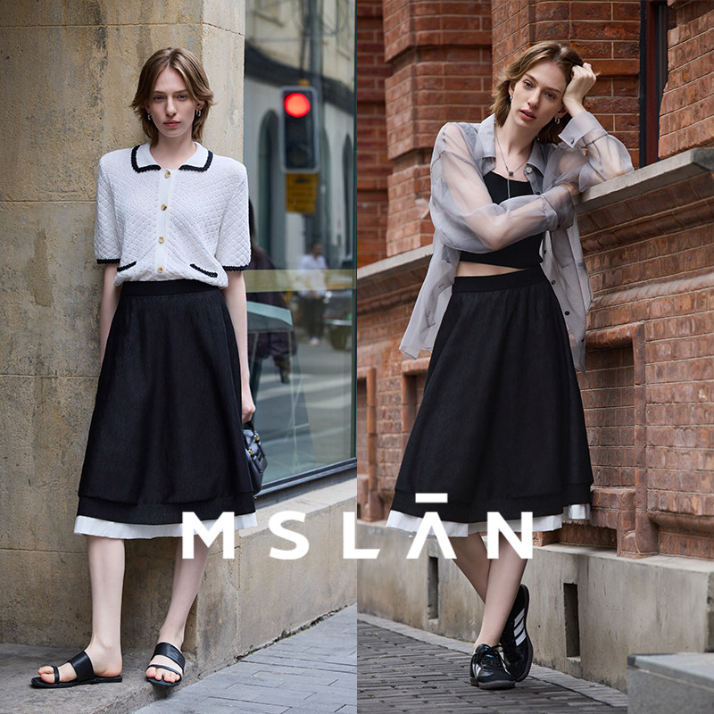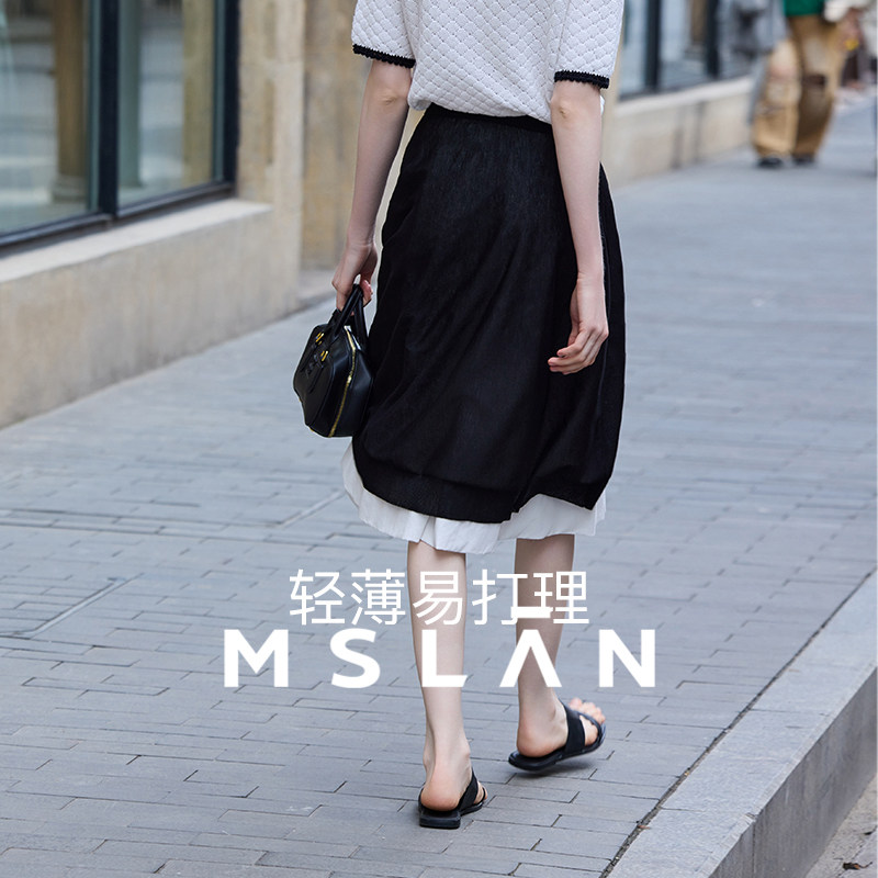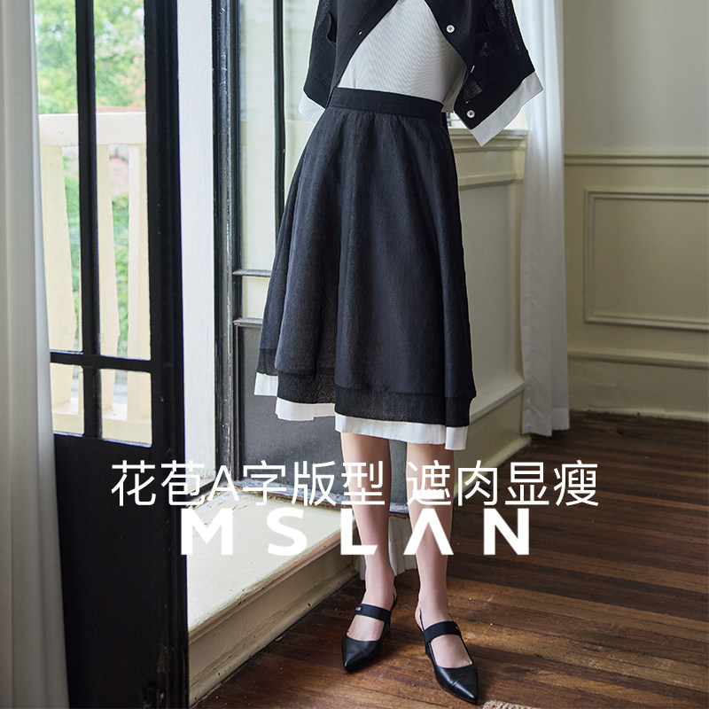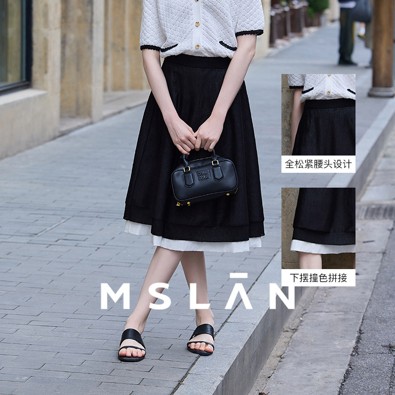 MSLAN复古黑白撞色轻盈针织A字裙呼吸感花苞拼接松紧腰质感半身裙