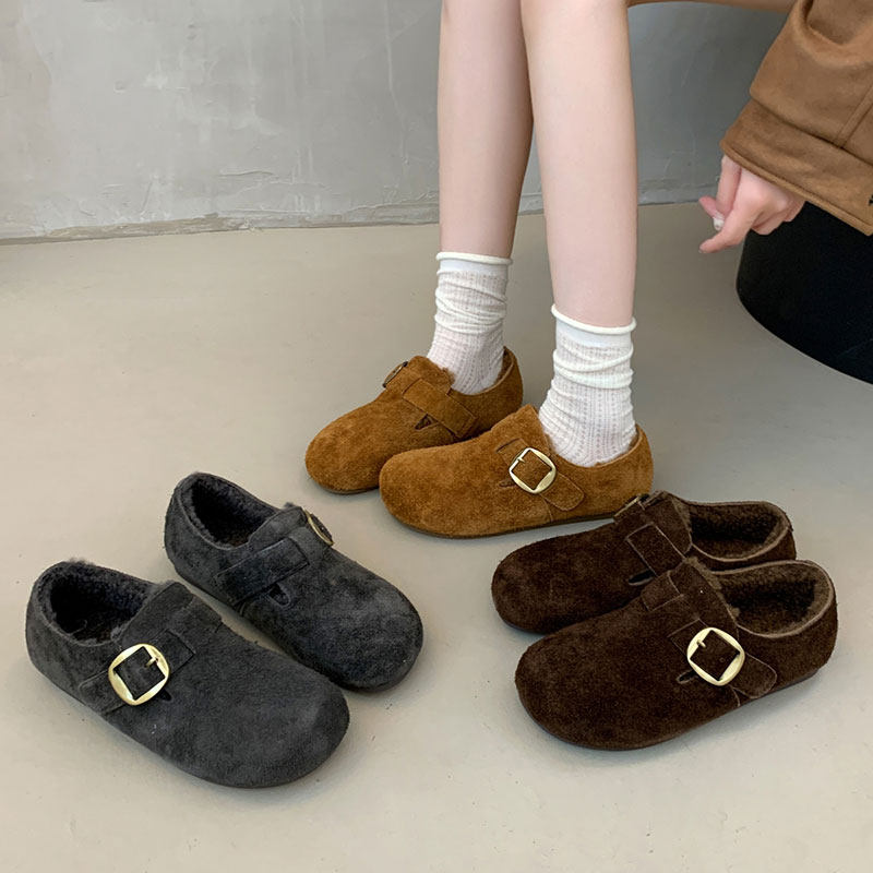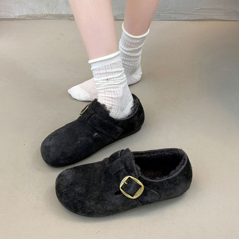 TATAFOCUS~加绒毛毛鞋韩版圆头皮带扣2025冬季新款勃肯鞋女35-28