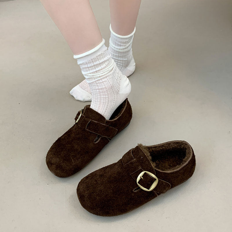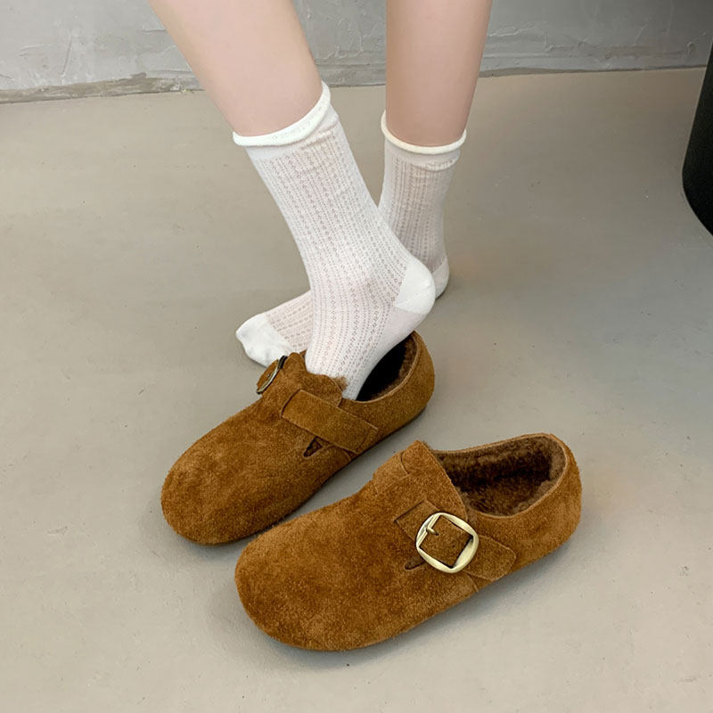 平底加绒复古全包勃肯鞋女2025秋冬新款保暖一脚蹬棉鞋防滑豆豆鞋