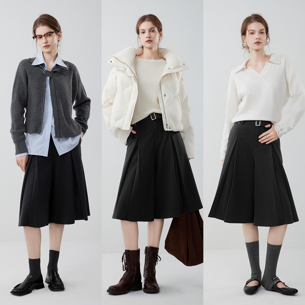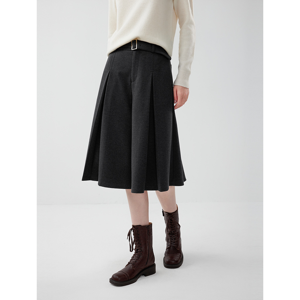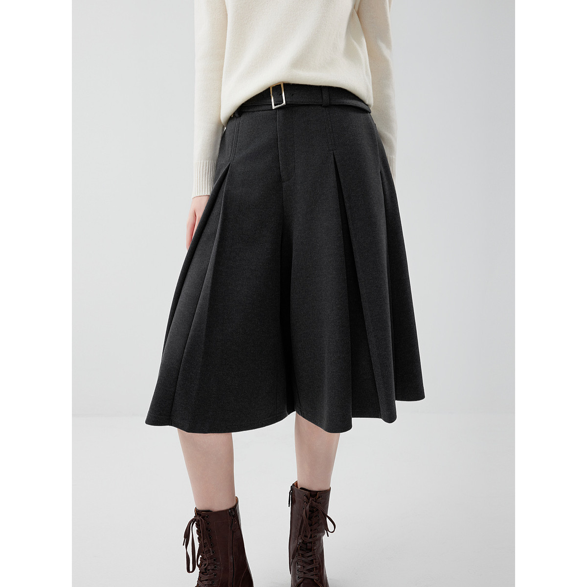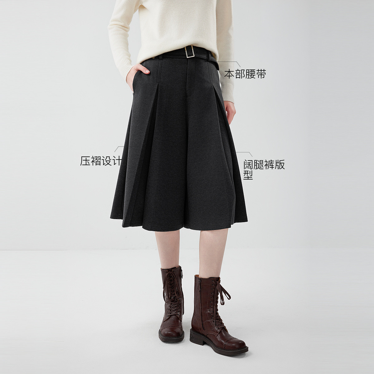 ELLE灰色格雷系设计感休闲裙裤女2025冬季新款腰带时髦阔腿中裤子