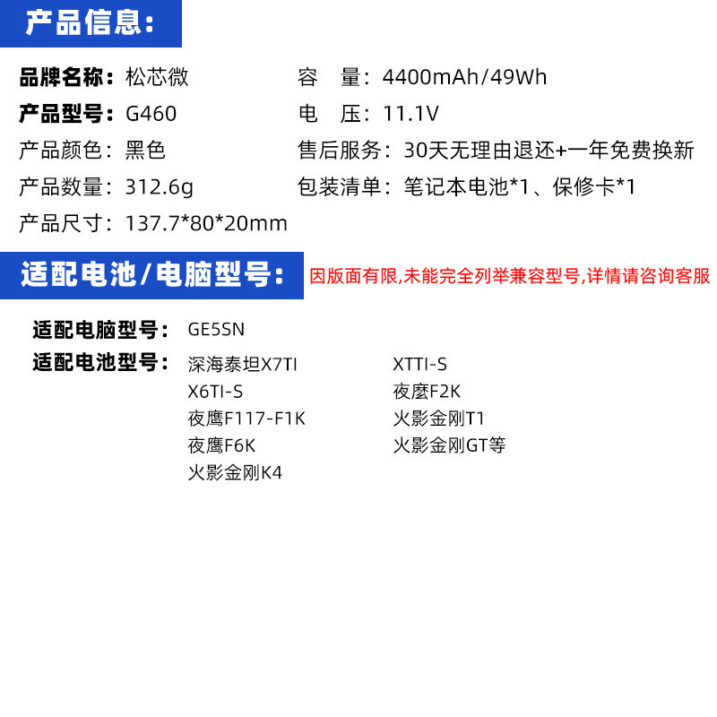 适用于机械革命深海泰坦x7ti X7Ti-s X6TI-S电池GE5SN炫龙炎魔火影金刚GT T1 K4夜鹰F117 F6K笔记本电池