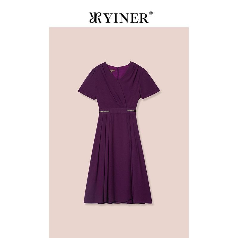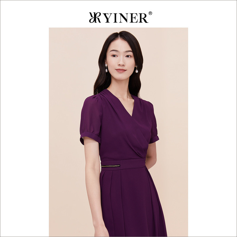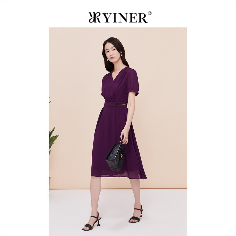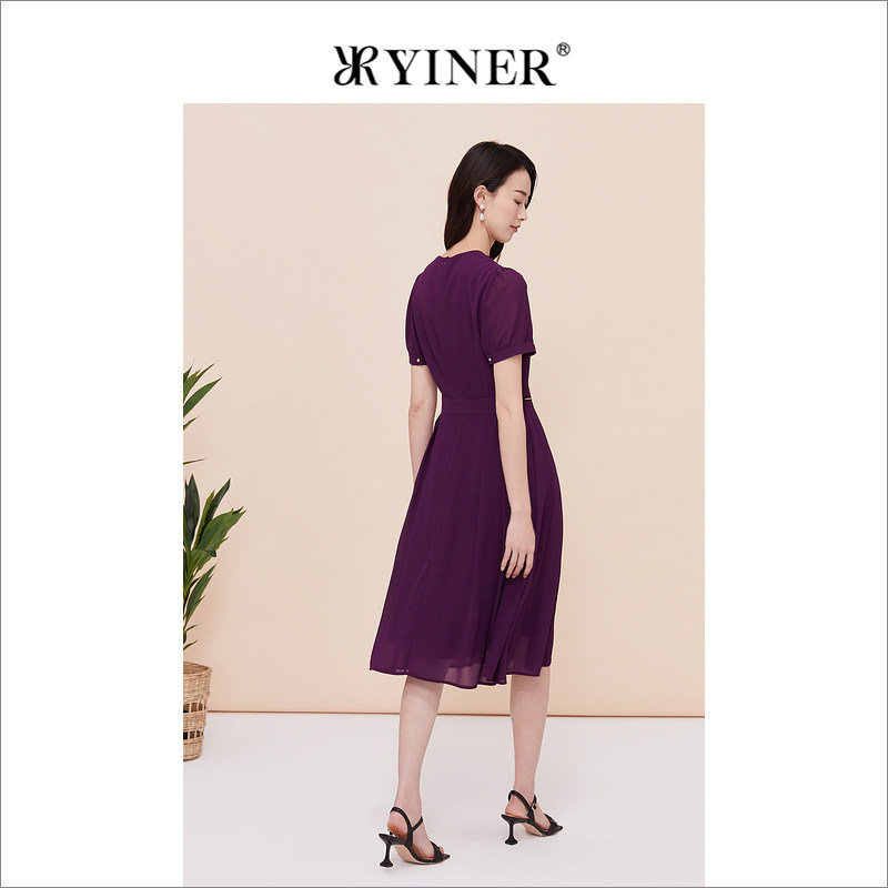YINER音儿专选女装夏季V领收腰显瘦饰链紫色连衣裙