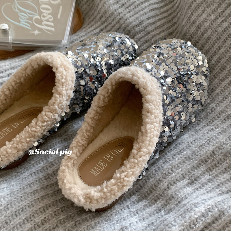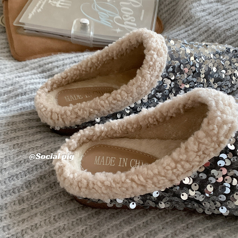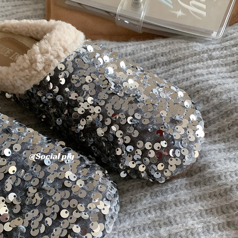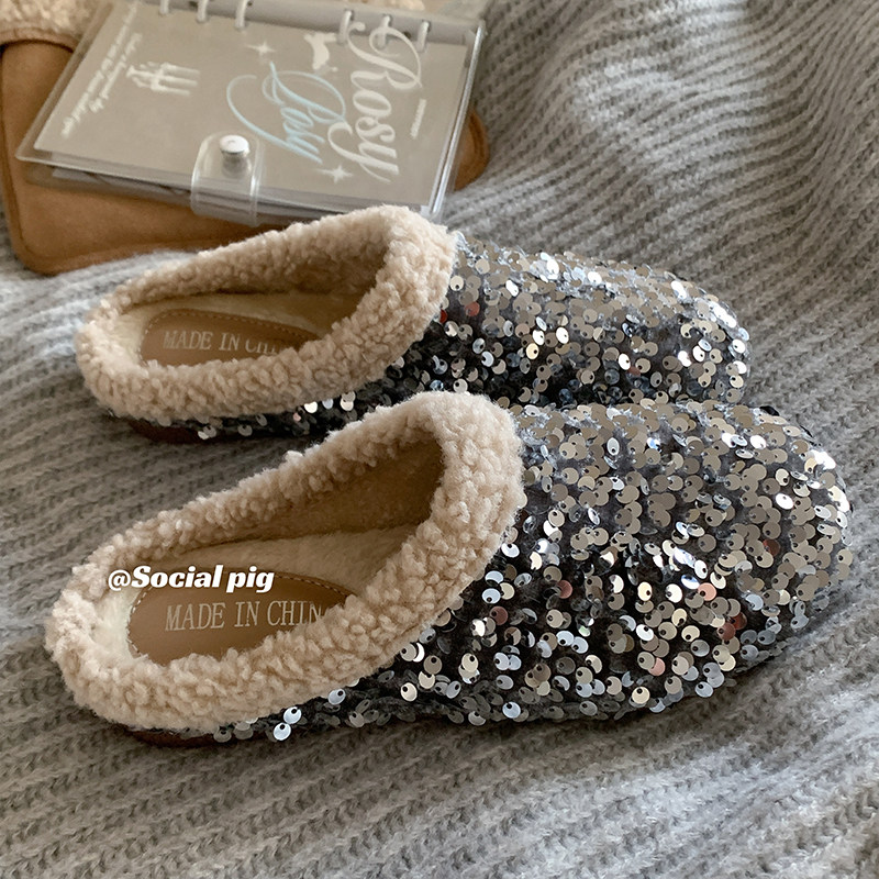真的美哭了!亮片复古感十足 !毛毛拖鞋女加绒保暖 平底棉拖鞋