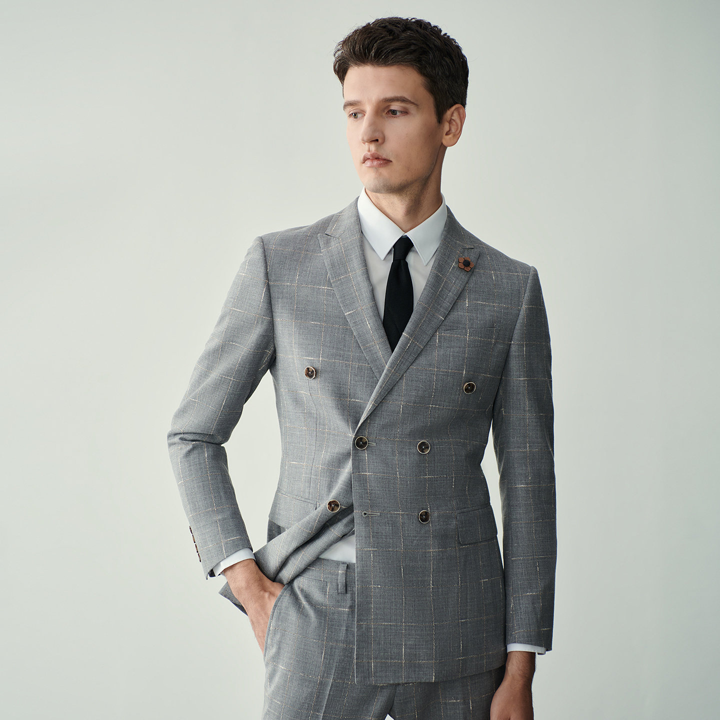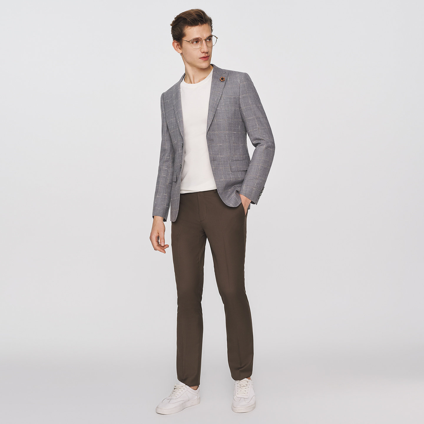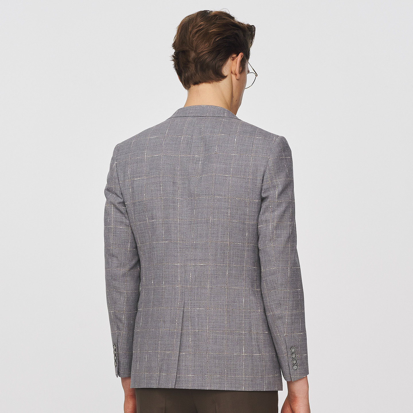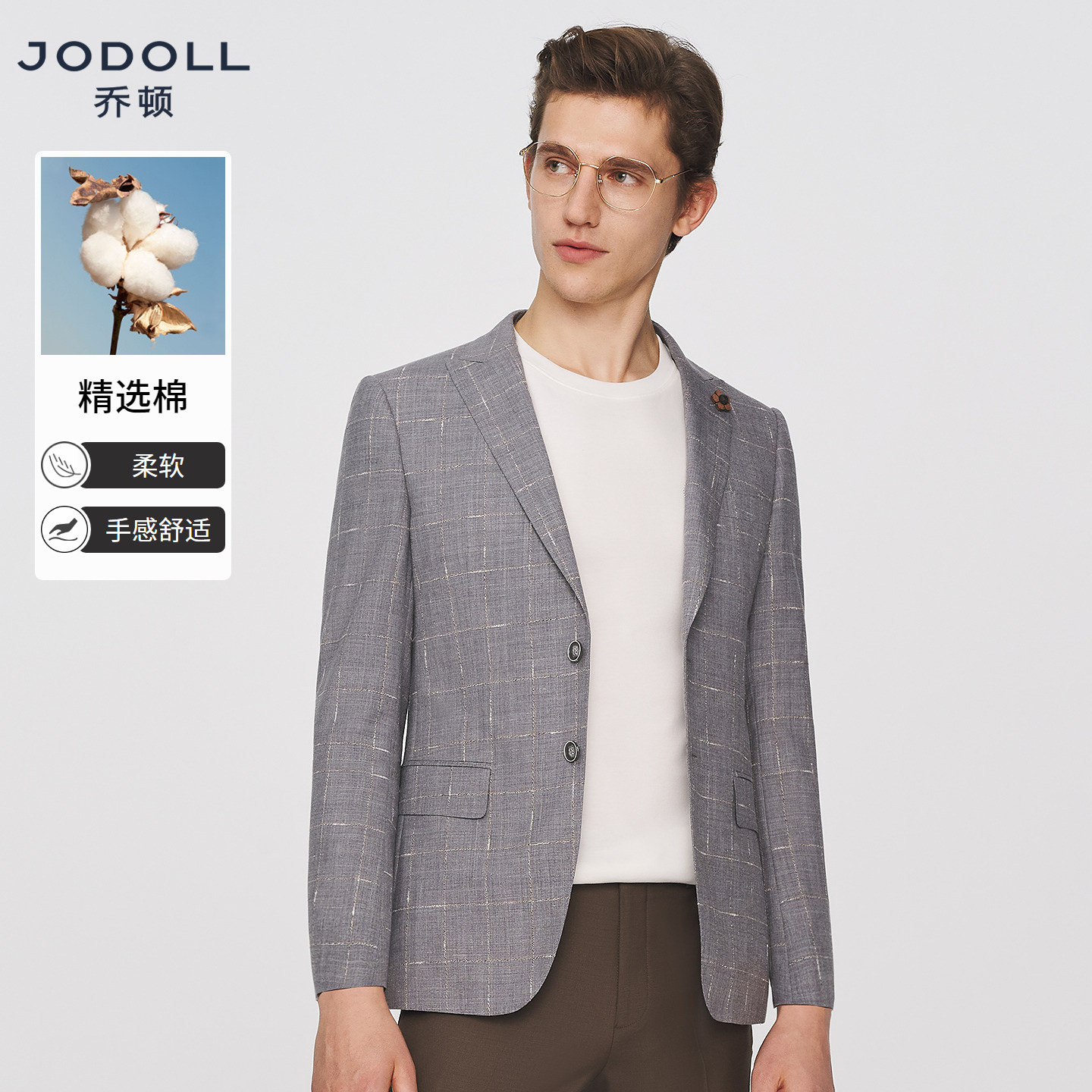 JODOLL乔顿西服套装上衣男士商务修身灰色格子绵羊毛苎麻西装外套