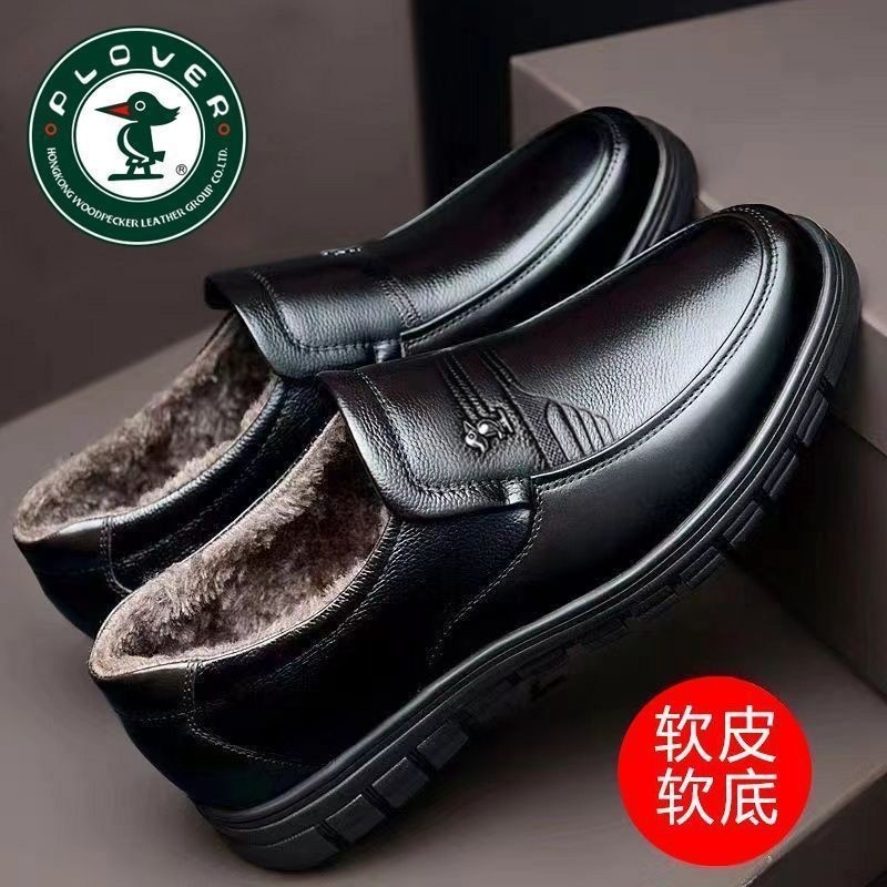 PLOVER软皮皮鞋男士冬季新款加绒软底一脚蹬休闲鞋中年爸爸鞋防滑
