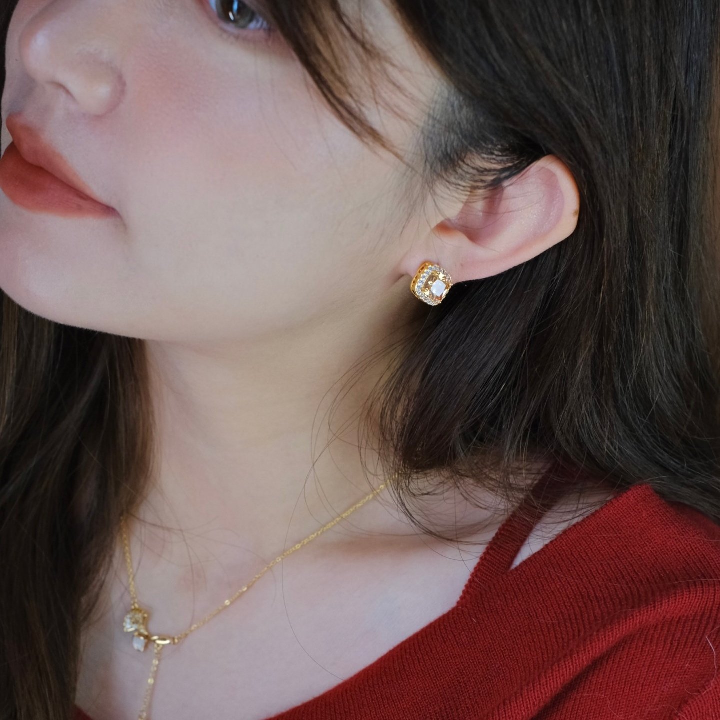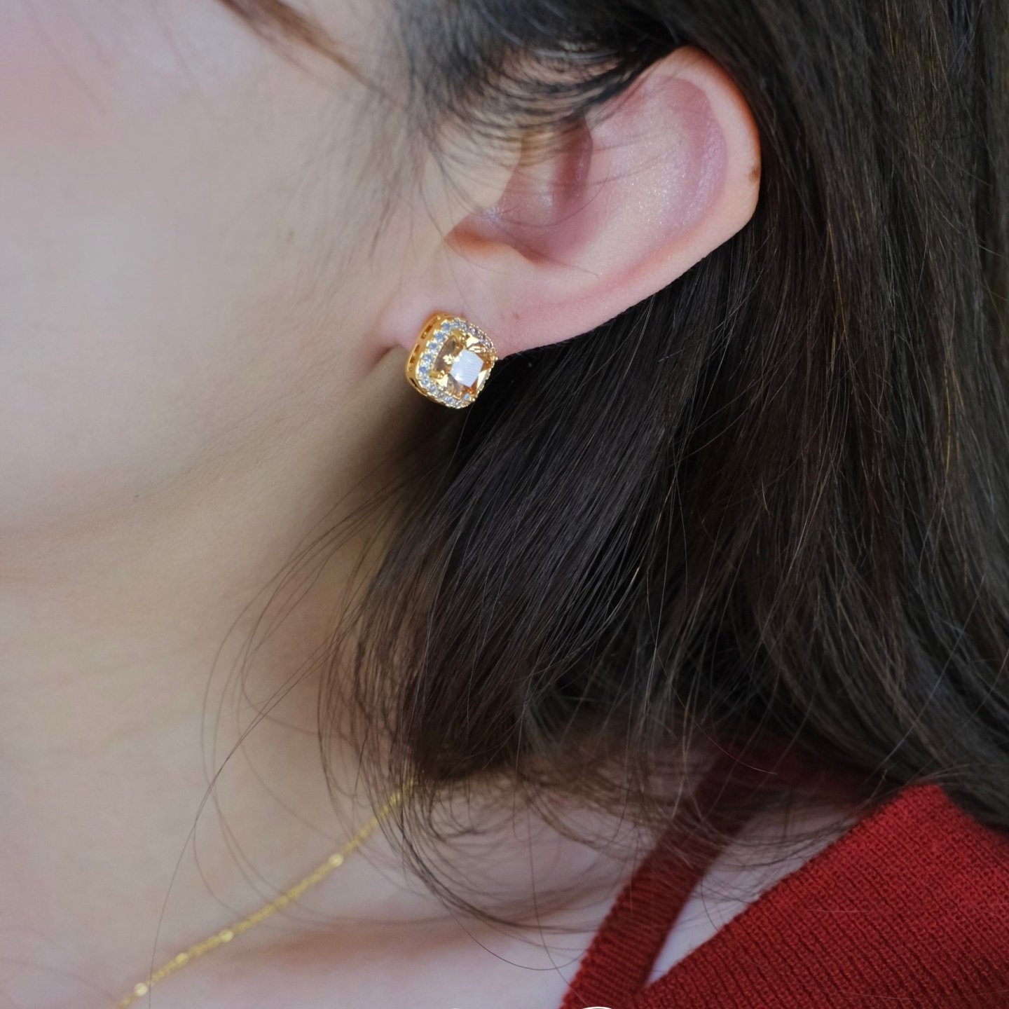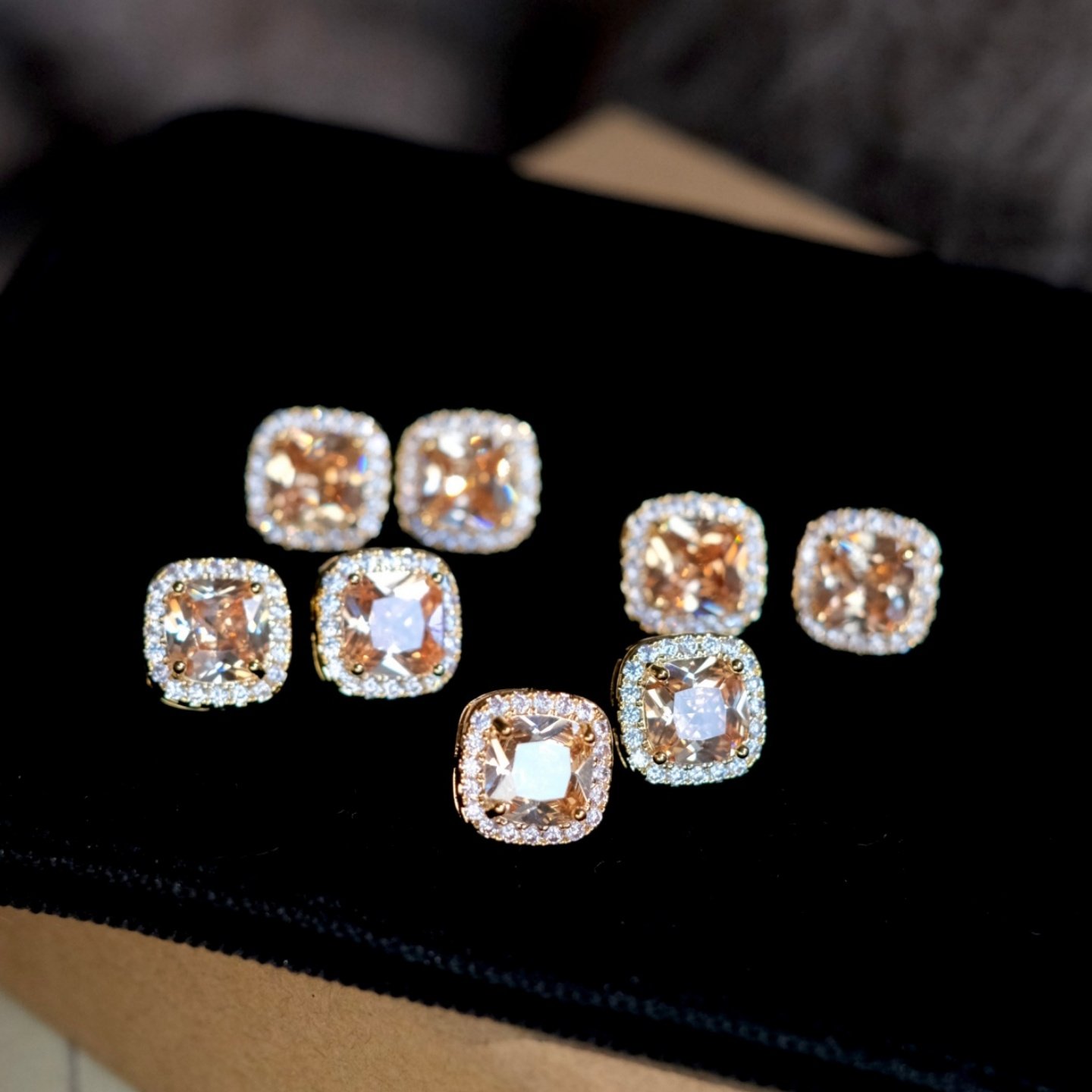 《一口芬达》法式轻奢爆闪满钻方糖香槟金色锆石耳钉耳环耳夹耳饰