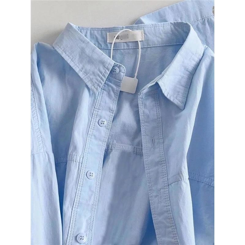 大码长袖纯棉衬衫女别致2025春秋装夏季新款蓝色宽松上衣衬衣外套
